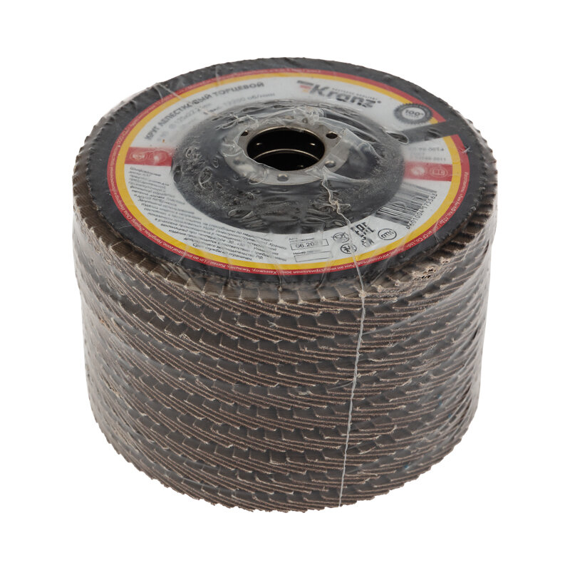 Лепестковый торцевой круг применяется совместно с ручными угловыми шлифовальными машинами (болгарками) соответствующего диаметра.Шлифовальные диски предназначены для предварительной, промежуточной и финишной обработки металла, дерева, пластика и других материалов. Конструктивная особенность кругов – веерное расположение лепестков абразивного материала, что обеспечивает плавную работу круга и отсутствие перегрева в зоне шлифования.Лепестковый круг изготовлен из шлифовальной шкурки на тканевой основе.Благодаря торцевому типу диска (T-29) увеличивается пятно контакта, что повышает скорость обработки поверхности и уменьшает возможность возникновения дефектов в виде зарезов, ям и прижогов.Тканевая основа лепестков равномерно изнашивается в процессе работы и открывает следующий слой абразива, позволяя полностью использовать ресурс круга.Наружный диаметр – 125 мм, посадочный – 22,2 мм. Max 12200 RPM.