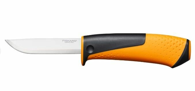 Нож Fiskars оснащён эргономичной рукоятью из фибергласа и подходит для работ в домашних условиях или на выездах. Ножны оснащены встроенной точилкой и клипсой для крепления к ремню. Клинок изготовлен из качественной нержавеющей стали и остаётся острым долгое время.