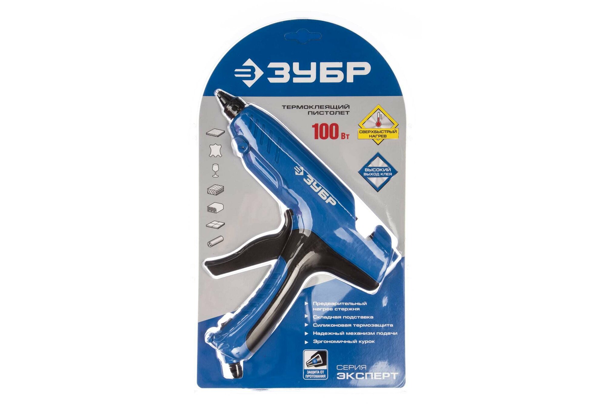 Клеевой пистолет ЗУБР профессиональный пистолет для широкого спектра применения, склеивает древесину, металл, керамику, стекло, пластмассу, кожу, ткани. Быстрый выход клея для высокопроизводительных работ. На корпусе предусмотрен выключатель для быстрого перевода инструмента в рабочий режим и режим ожидания. Предварительный нагрев клеевого стержня позволяет быстро достичь рабочей температуры и обеспечить ее постоянный уровень. Металлический наконечник защищен силиконовой накладкой.