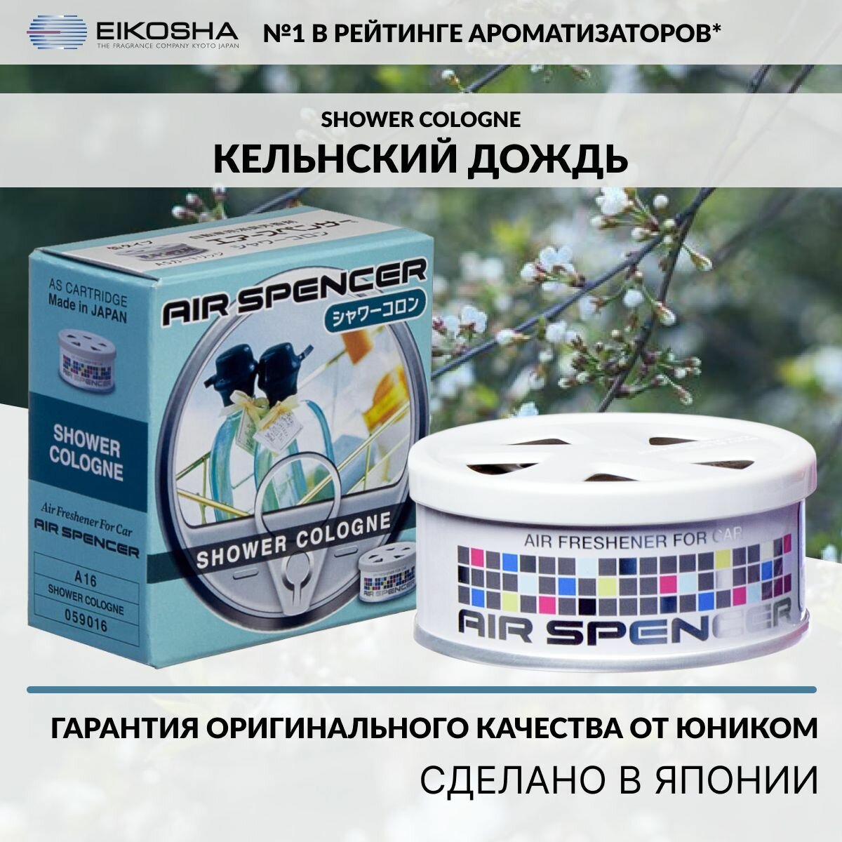 Eikosha Ароматизатор меловой Spirit Refill Shower Cologne Пряный, чувственный аромат Eternity от Calvin Klein с выраженной древесно-цветочной нотой. Наполняет автомобиль приятным запахом. Отличное дополнение интерьера автомобиля. Способ применения: Снимите верхнюю пластиковую крышку с баночки. Потяните за металлическую петлю и удалите металлическую крышку. Поставьте на место пластиковую крышку. С помощью двусторонней клеящей ленты установите на выбранное место. Интенсивность запаха можно регулировать с помощью подвижной решетки на пластиковой крышке.