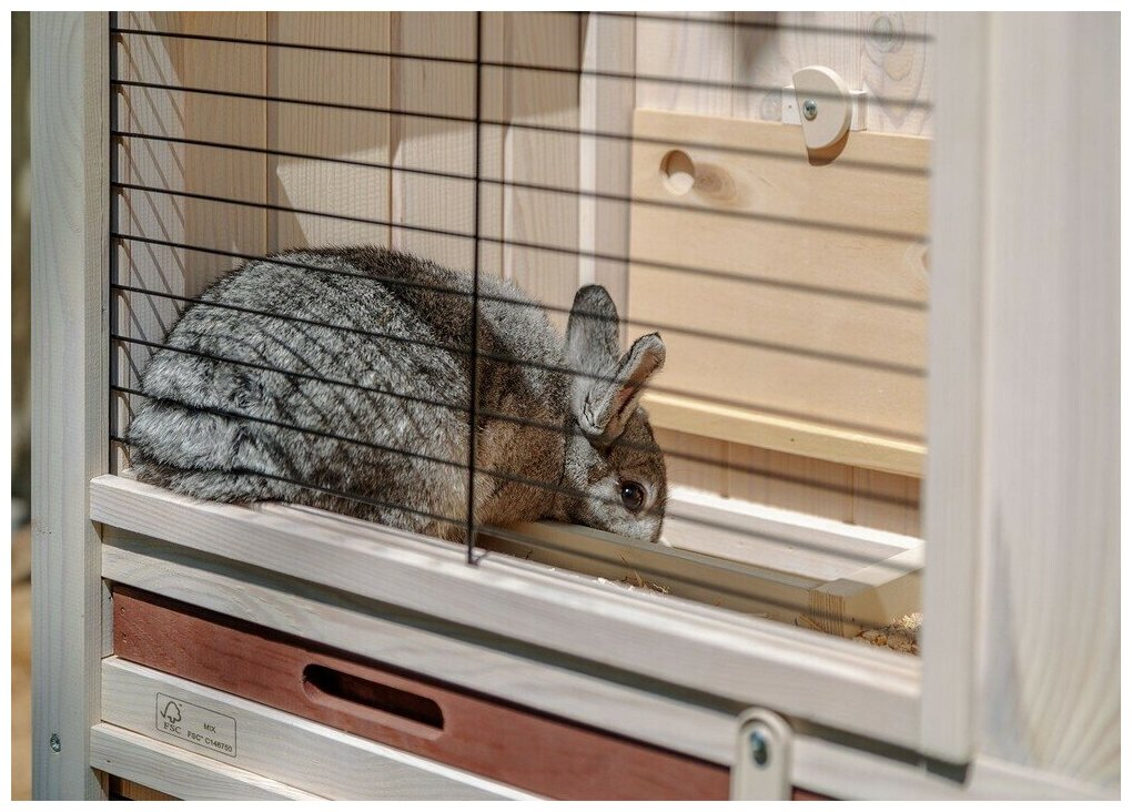 Клетка для кроликов Ferplast Ranch 100 Basic, бело-коричневая, 92*47*81 см Двухуровневая клетка для кроликов Изготовлена из древесины северной сосны FSC, поставляемой из специально отведенных лесов, обработана специальным нетоксичным лаком. Нижний уровень огорожен решеткой и имеет сдвижную дверцу с безопасным замком На верхнем уровне есть вместительный поддон из дерева с высокими бортиками, задвигающийся внутрь Комфортабельный домик для отдыха на верхнем уровне Откидная крыша Деревянная лесенка между уровнями входит в комплект Внешние размеры, включая крышу: 92*47*81 см Размеры нижнего этажа: 86*42 см Размер домика для кролика: 31*36,5 см Клетка для кроликов Ranch 100 Basic предоставляет все удобства, необходимые вашему кролику. Она подходит как для наружного, так и для внутреннего использования, прочная и долговечная, изготовлена из древесины северной сосны, сертифицированной по схеме FSC® и добываемой только в лесах, легально и ответственно управляемых лесозаготовительными предприятиями, в соответствии со строгими экологическими, социальными и экономическими стандартами. Древесина защищена экологически-безопасным, нетоксичным, водоотталкивающим покрытием, предотвращающим образование плесени, устойчивым к ультрафиолету, нанесенным при помощи технологии порошкового окрашивания для увеличения срока службы изделия. Для увеличения долговечности конструкции доски очень тщательно подгоняются и соединяются с помощью винтов.Клетка имеет особую двухуровневую конструкцию, разделенную на несколько зон, предназначенных для удовлетворения потребностей вашего питомца на протяжении дня. На нижнем уровне – территория, огороженная металлической решеткой, со сдвижной дверкой, закрытой на безопасный замок, и деревянная лесенка, ведущая наверх. На верхнем этаже находится спокойная зона с глубоким деревянным основанием и выдвижным лотком, а также уютный домик для отдыха с милыми рисунками снаружи.Уход? Нет проблем! Клетка для кроликов Ranch 100 Basic имеет откидную крышку для удобной чистки и вынимания кролика в случае необходимости. Также имеется вместительный съемный лоток из дерева, скрытый за деревянной откидной панелью. Отверстие для перехода на нижний этаж может закрываться крышкой, что очень удобно во время уборки, а высокие края предотвращают просыпание наполнителя.Клетка для кроликов Ranch 100 Basic поставляется в двух цветах. Выберите тот, который вам больше понравится для жилища вашего маленького друга!