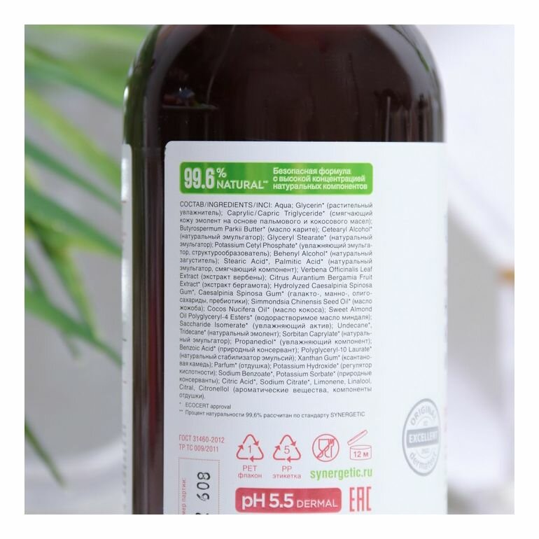 | Химический состав | Aqua, Glycerin (растительный увлажнитель), Caprylic/Capric Triglyceride (смягчающий кожу эмолент на основе пальмового и кокосового масел), Butyrospermum Parkii Butter (масло карите), Cetearyl Alcohol (натуральный эмульгатор), Glyceryl Stearate (натуральный эмульгатор), Potassium Cetyl Phosphate (увлажняющий эмульгатор, структурообразователь), Behenyl Alcohol (натуральный загуститель), Stearic Acid, Palmitic Acid (натуральный эмульгатор, смягчающий компонент), Verbena Officinalis Leaf Extract (экстракт вербены), Citrus Aurantium Bergamia Fruit Extract (экстракт бергамота), Hydrolyzed Caesalpinia Spinosa Gum, Caesalpinia Spinosa Gum (галакто-, манно-, олигосахариды, пребиотики), Simmondsia Chinensis Seed Oil (масло жожоба), Cocos Nucifera Oil (масло кокоса), Sweet Almond Oil Polyglyceryl-4 Esters (водорастворимое масло миндаля), Saccharide Isomerate (увлажняющий актив), Undecane, Tridecane (натуральный эмолент), Sorbitan Caprylate (натуральный эмульгатор), Propanediol (увлажняющий компонент), Benzoic Acid (природный консервант), Polyglyceryl-10 Laurate (натуральный стабилизатор эмульсий), Xanthan Gum (ксантановая камедь), Parfum (отдушка), Potassium Hydroxide (регулятор кислотности), Sodium Benzoate, Potassium Sorbate (природные консерванты), Citric Acid, Sodium Citrate, Limonene, Linalool, Citral, Citronellol (ароматические вещества, компоненты отдушки). |