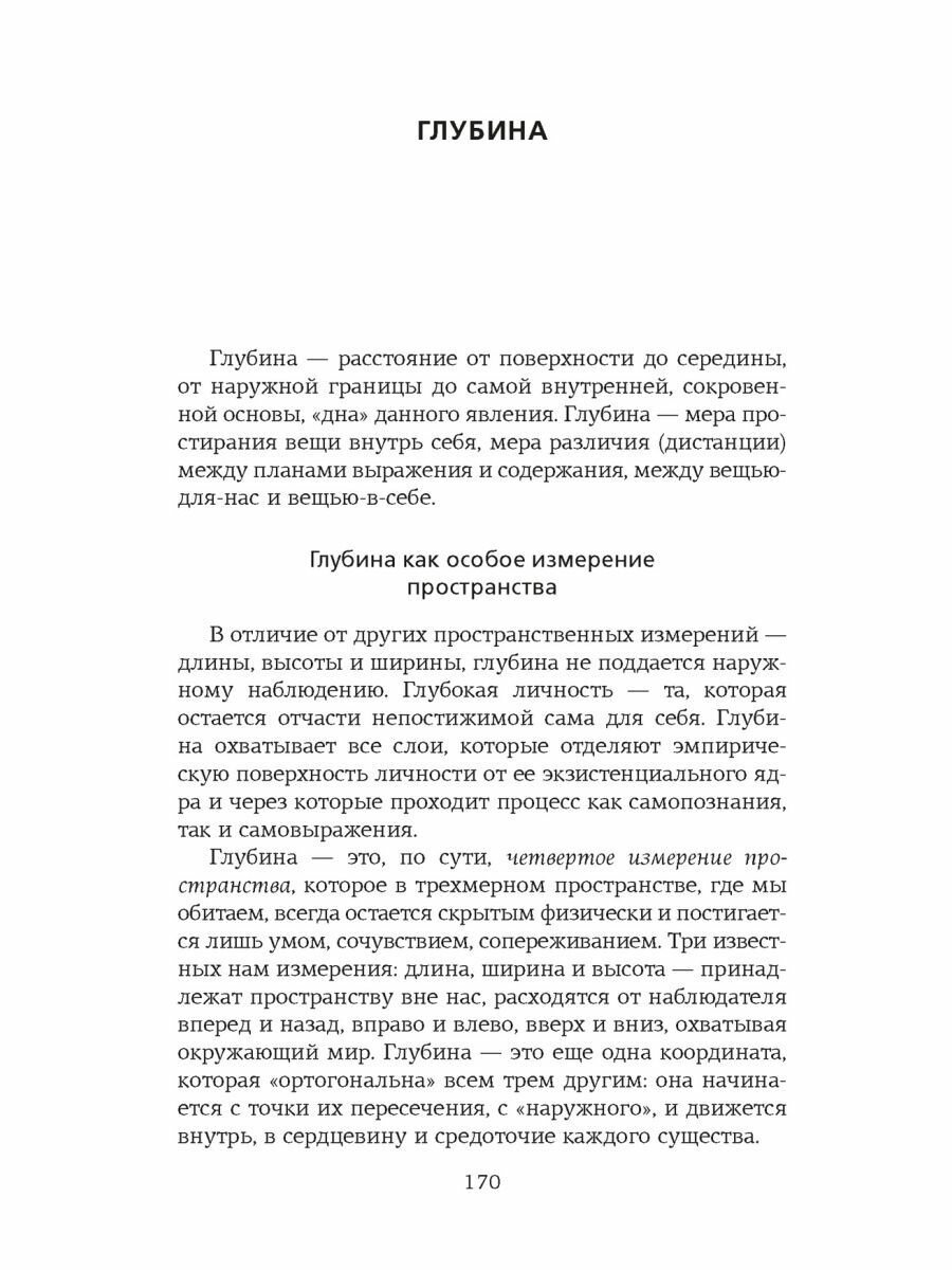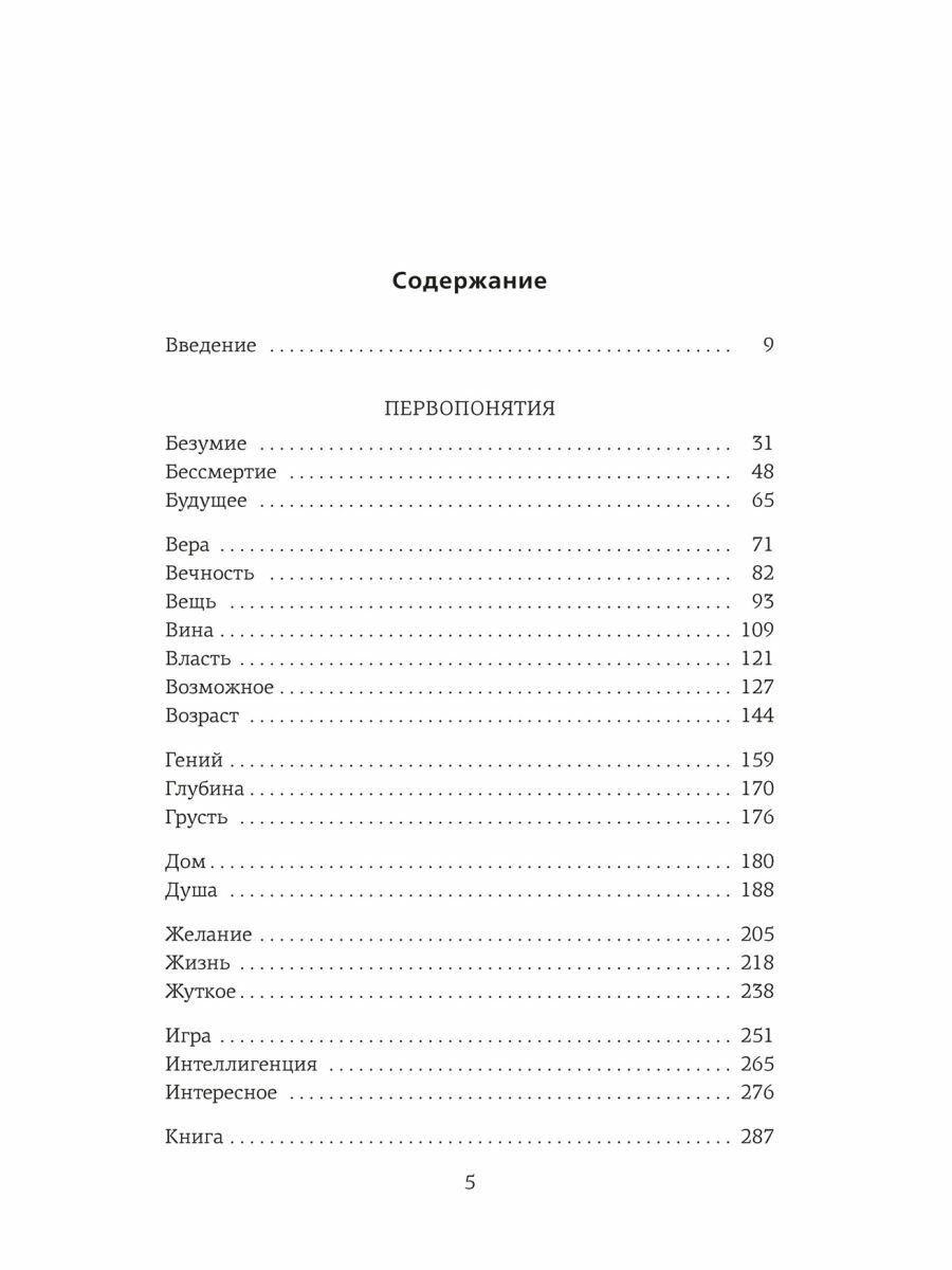 Сборник эссе, посвященных основным понятиям, которыми оперирует человечество: душа, гений, безумие, творчество и т.д. Автор рассматривает их по отдельности и во взаимодействии, разбирает смыслы, которые могут в них вкладываться людьми. Не столько исчерпывающие объяснения, сколько материал для дальнейших самостоятельных размышлений. Текст написан интересно, легко и понятно, содержание идет в алфавитном порядке. Единственный минус издания - интегральная обложка, которая слишком легко заламывается.