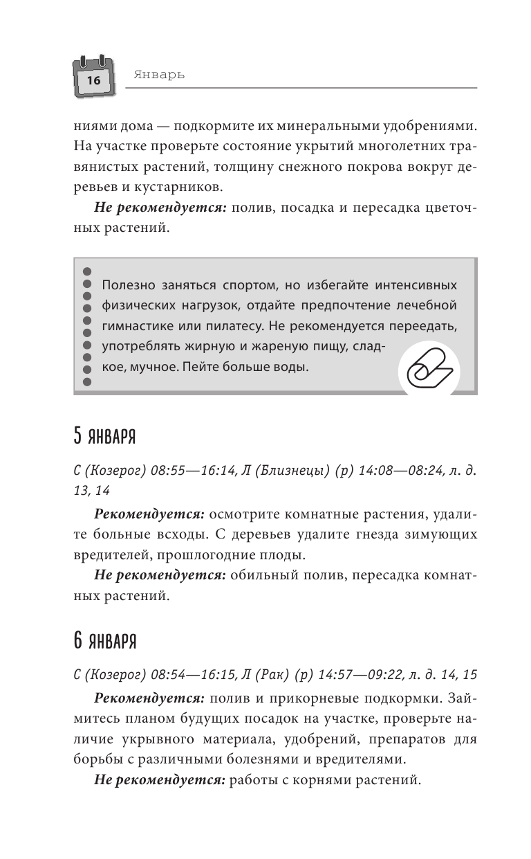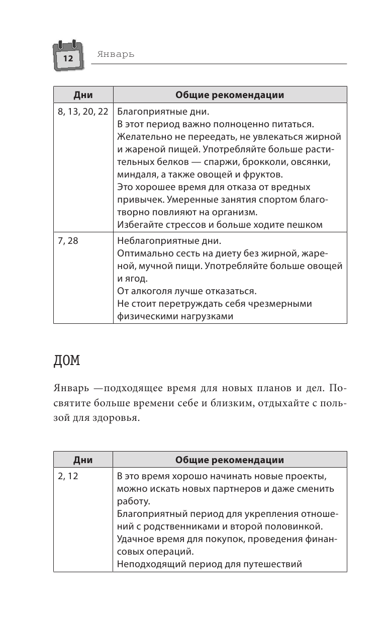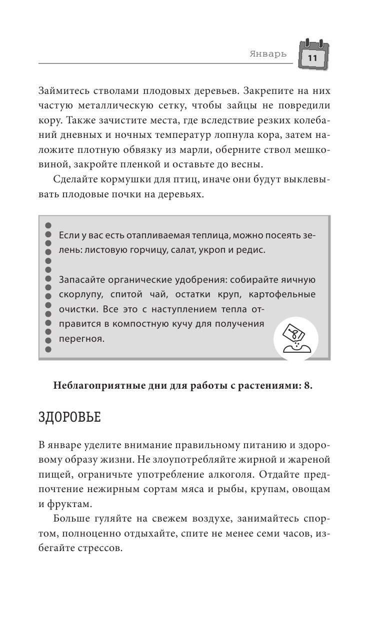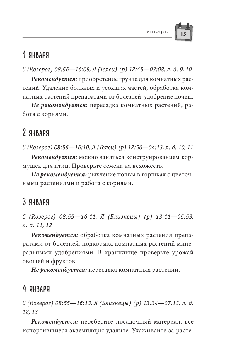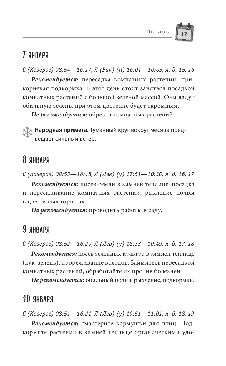 С каждым новым сезоном я закупаюсь новыми лунными календарями, для меня это уже своего рода традиция. И этот год, как я вижу, очень богат на подобного рода приобретения) Конкретно данный календарь для меня в наступающем году точно будет центральным, потому что он очень подробный. Делится он сначала по месяцам, а затем по дням. В каждой из таких 12 глав содержатся детальные ежедневные рекомендации. В них есть все: советы по дому, по здоровью, по саду и огороду, естественно, а также народные...