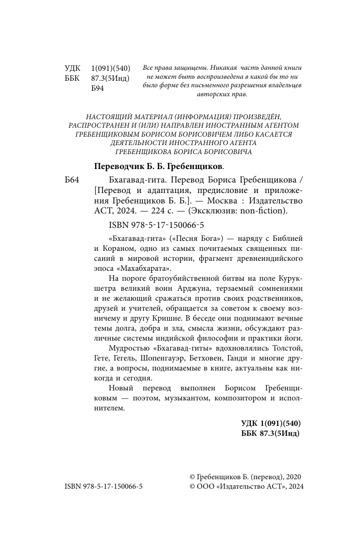 Бхагавад-гита. Перевод Бориса Гребенщикова (Борис Борисович Гребенщиков); АСТ, 2024