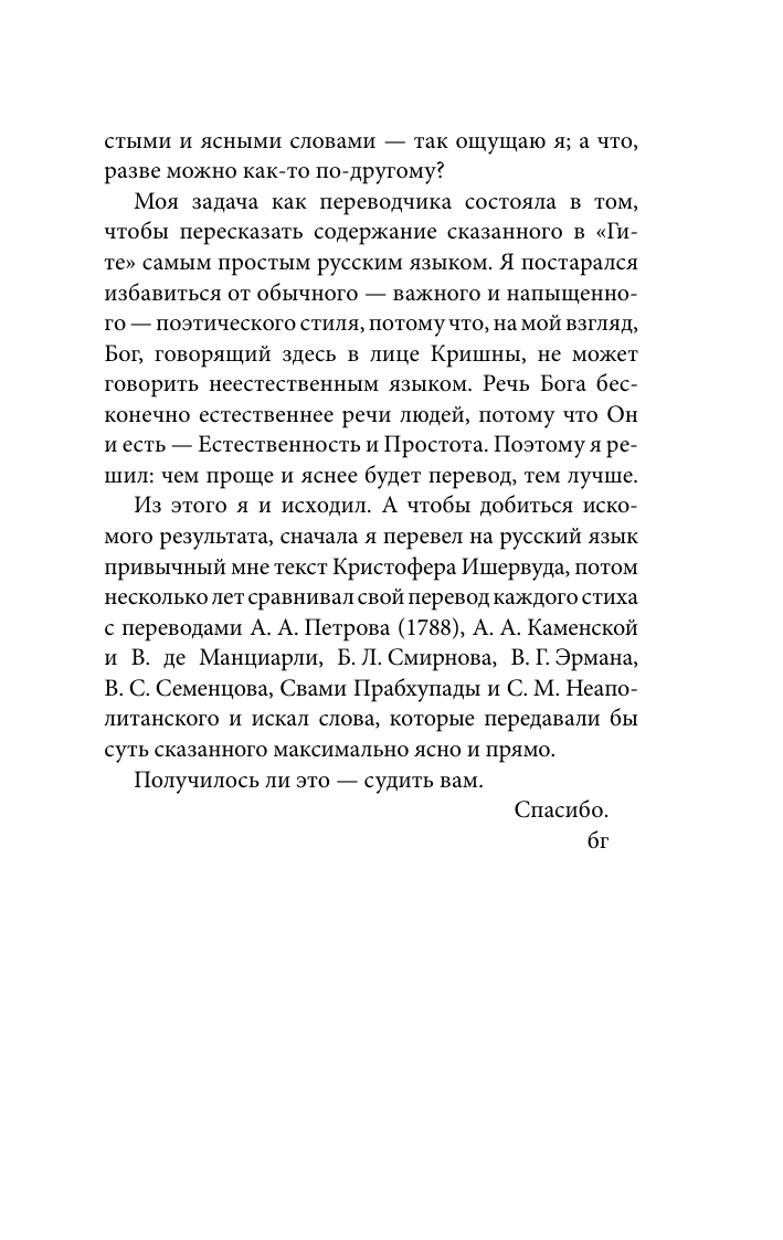 Как и всё, что так или иначе связано с БГ — этот перевод очень хорош. Читала Бхагавад-гиту в разных вариантах, с комментариями и без, но именно БГ зацепил своей простотой и лёгкостью.