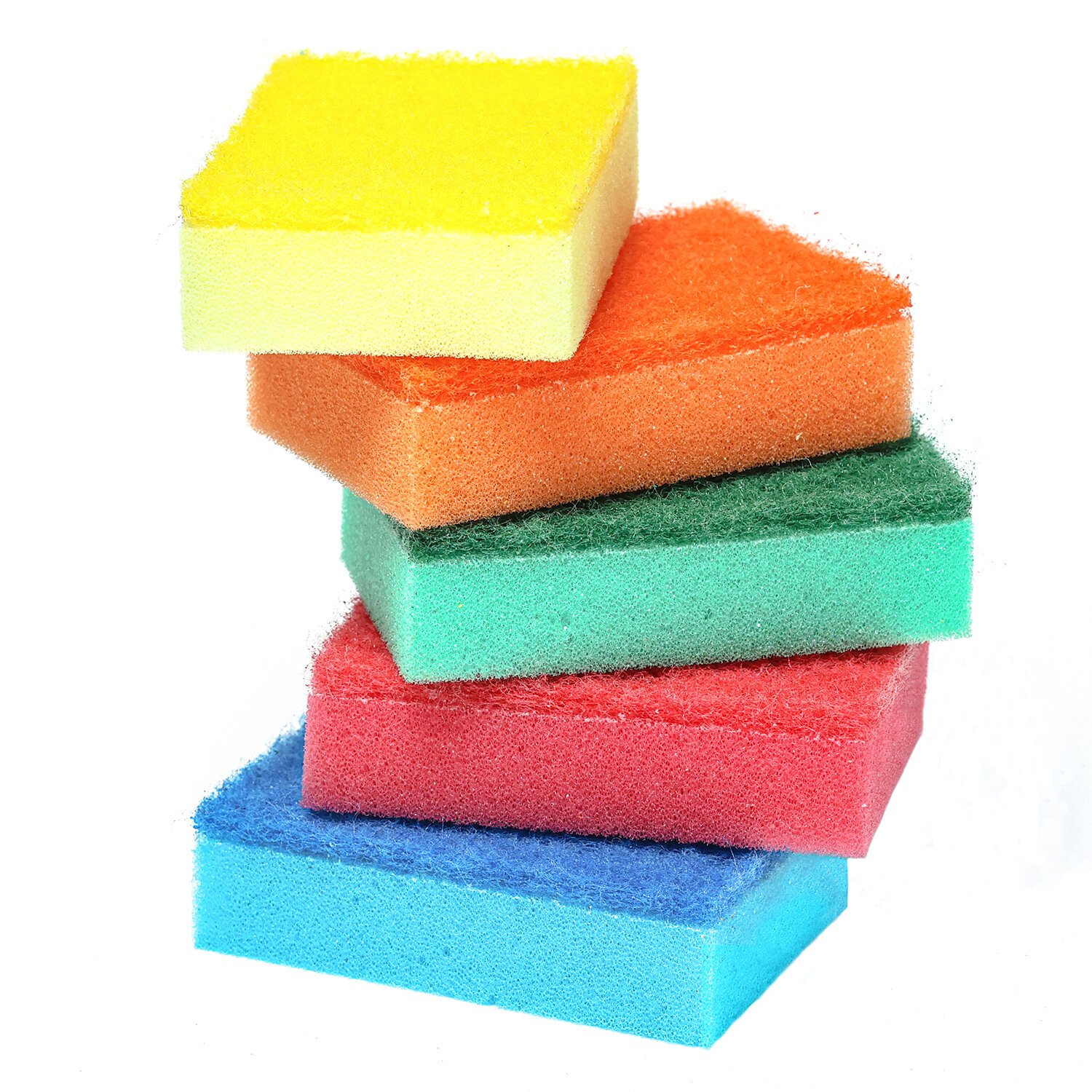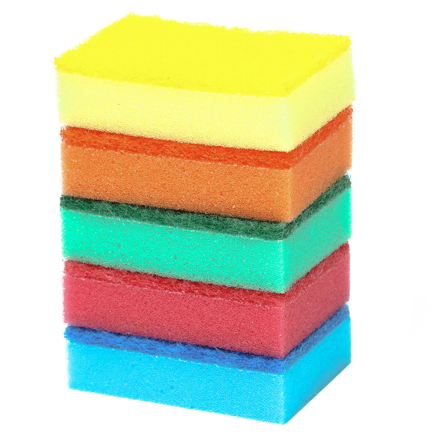 Классические губки для посуды ярких цветов, среди которых покупатель может выбрать удобные ему по размеру и количеству. Губки изготовлены из пенополиуретана и абразивной фибры, позволяющей удалять сильные загрязнения с любых поверхностей.