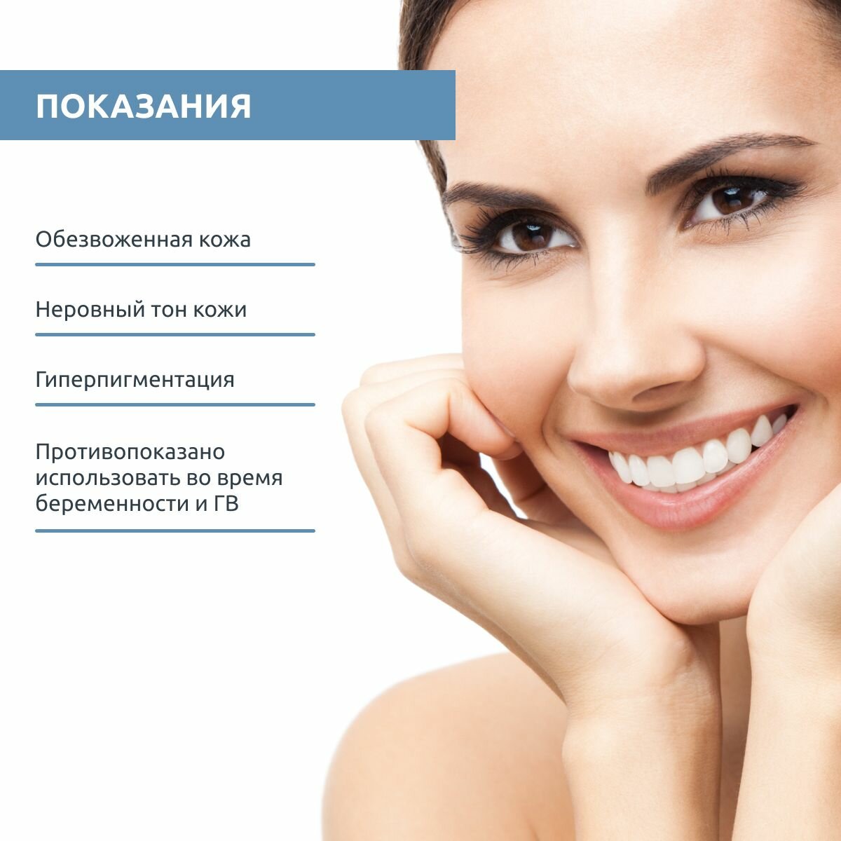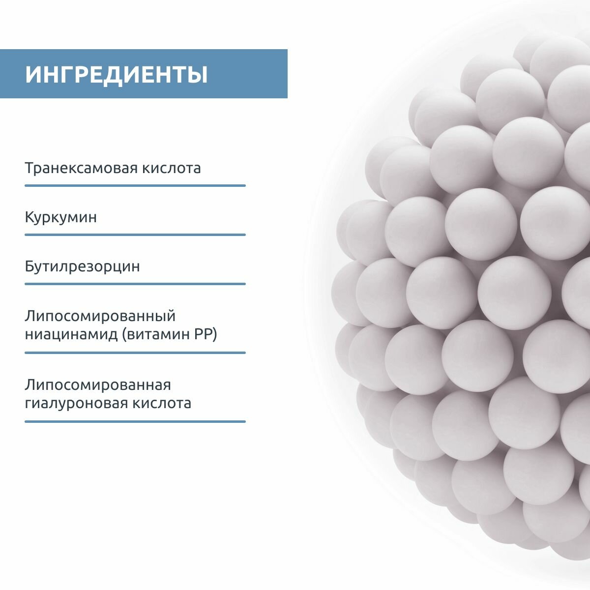 - Транексамовая кислота деликатно отбеливает кожу, борется с пигментными пятнами, укрепляет стенки сосудов, снимает раздражение, в целом улучшает и выравнивает тон кожи.