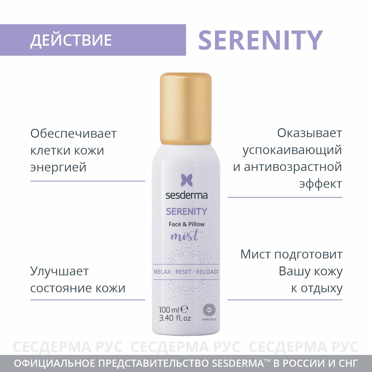 Спрей-мист ночной для лица и подушки Serenity предназначен для улучшения состояния кожи в ночное время. Обеспечивает энергией клетки кожи, способствуя их восстановлению и регенерации. Оказывает успокаивающий и антивозрастной эффект. Улучшает состояние кожи. Подходит для всех типов кожи. Средство можно наносить на подушку, чтобы усилить успокаивающий эффект.