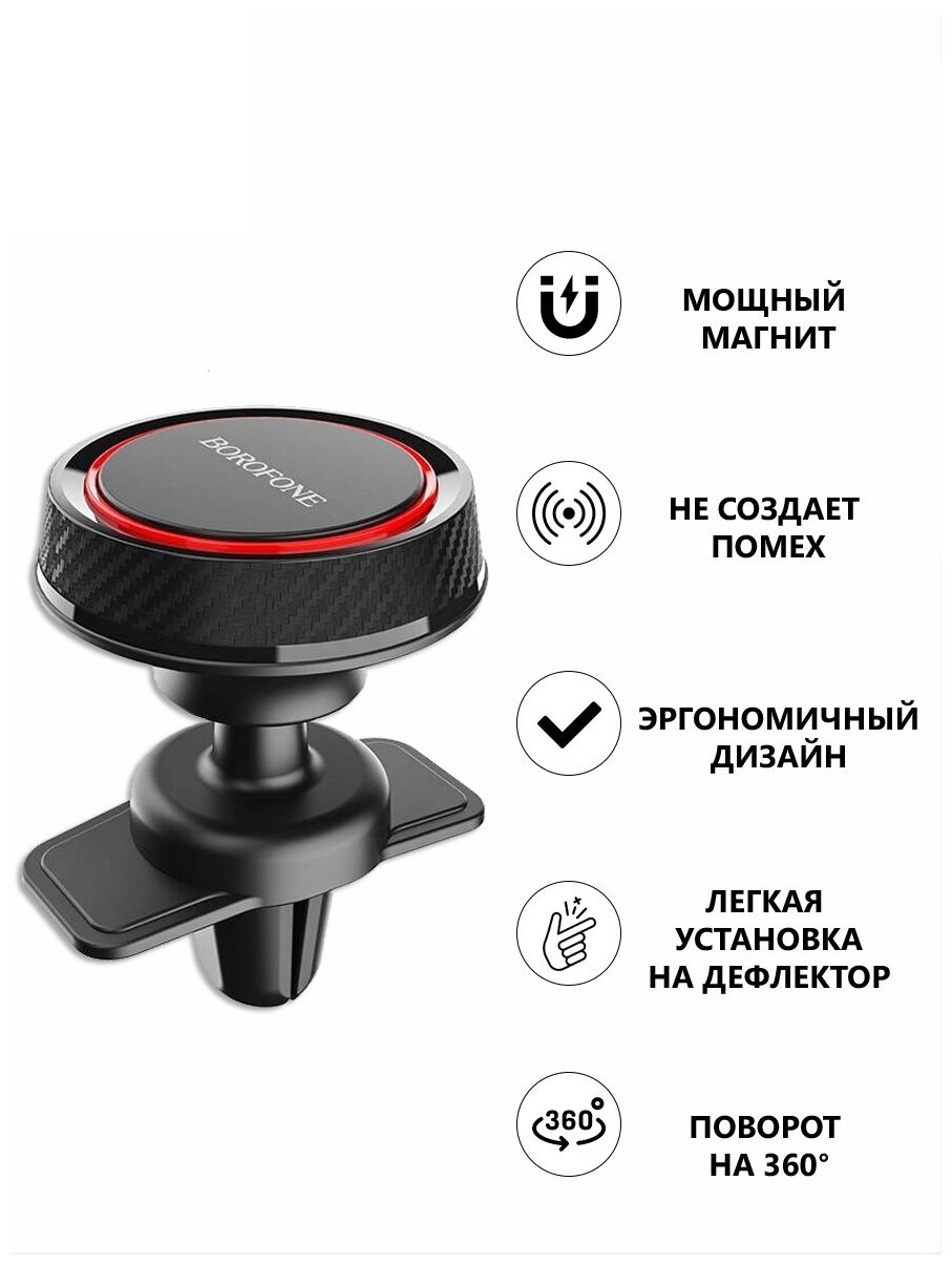 держатель для телефона в авто, магнитный держатель для телефона на лобовое стекло, автомобильный держатель на приборную панель, держатель в авто на стекло, держатель для телефона на присоске, держатель на присоске автодержатель на панель авто универсальный, подарок автовладельцу в машину.BOROFONE серия Journey автомобильный держатель телефона для воздуховода, универсальное вращение1. Материал изготовления: PC + ABS + силикон.2. Обработка поверхности: текстурирование под карбон.3. Размеры: 64*42*61 мм, вес: 44 г.4. Ширина магнитной площадки: 42мм-42мм.5. Применение: мобильные телефоны, универсальный.6. Место крепления: для воздуховода.7. Универсальное вращение.