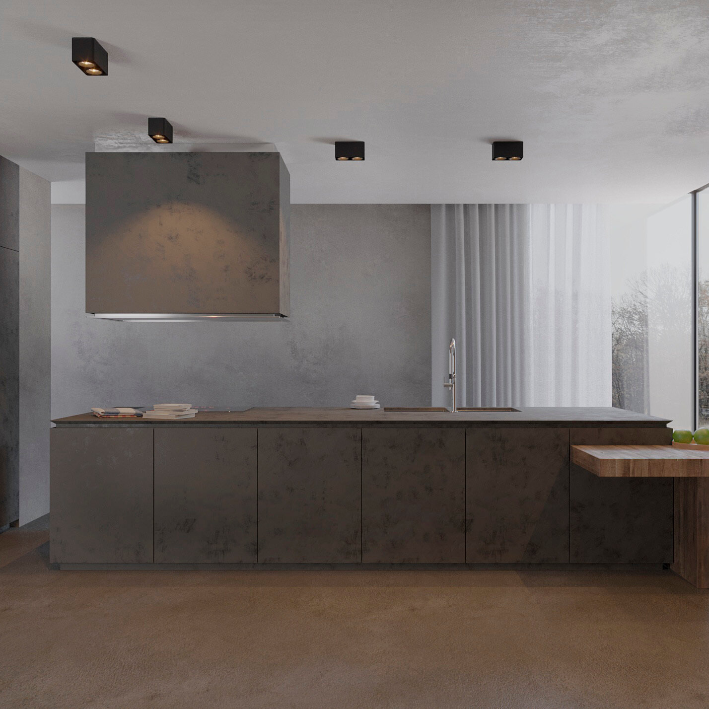 Накладной интерьерный светильник. Мощность 16 Вт, св. поток 1490 лм, 98 лм/Вт, дневной 4000 K, CRI>90, угол 45°, регулируемое направление луча 30°, напряжение питания 230 В. Черный квадратный корпус из алюминия, степень защиты IP20. Размер: длина 195 мм, ширина 100 мм, высота 100 мм. Монтаж накладной. Драйвер 26-40 В, 400 мА, пульсация