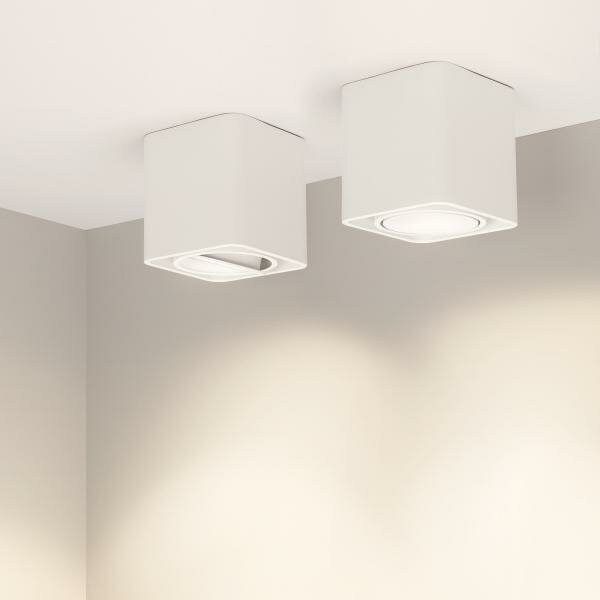 Накладной интерьерный светильник. Мощность 8 Вт, св. поток 760 лм, 98 лм/Вт, теплый 3000 K, CRI>90, угол 45°, регулируемое направление луча 30°, напряжение питания 230 В. Белый квадратный корпус из алюминия, степень защиты IP20. Размер: длина 100 мм, ширина 100 мм, высота 100 мм. Монтаж накладной. Драйвер 24-42 В, 200 мА, пульсация