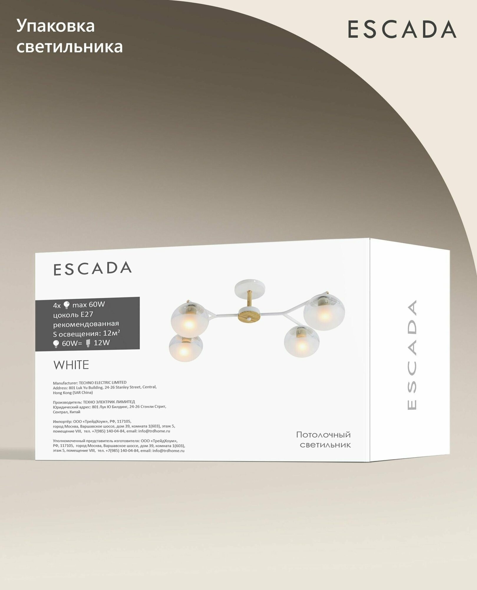 Потолочная люстра на штанге Avignon 1130/4PL E27 60W White/Gold - продукт известной компании Escada (Китай). Имеет максимальную мощность 240 Вт, освещает площадь до 12 кв. м. Отлично подойдет для таких мест, как гостиная, кафе, спальня, кухня. Впишется в интерьеры следующих стилей: модерн.