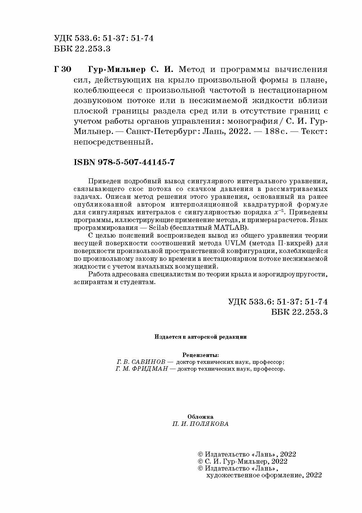 Метод и программы вычисления сил действующих на крыло произвольной формы в плане (Семен Гур-Мильнер); Издательство ЛАНЬ, 2022