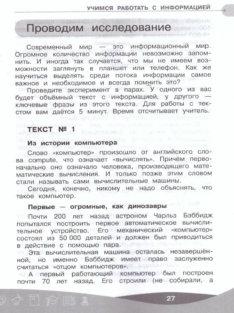 Пособие продолжает начатую во втором классе важную тему - это работа с информацией. Умение работать с информацией понадобится учащимся как при отборе источников для выполнения проекта, так и для систематизации полученной информации и превращения её в связный текст доклада. Пособие расскажет, какие приёмы можно использовать для лучшего запоминания информации и как её творчески преобразовывать. Учащиеся научатся критически отбирать информацию и оценивать её достоверность, анализировать прочитанное и делать выводы, представлять информацию в виде интеллекткарты и связного текста доклада. Финальный проект "Дебаты" поможет им на практике применить все полученные навыки, послужит отличной тренировкой по систематизации информации, преподнесению её аудитории в доступной форме, даст возможность развить умение критически осмысливать и парировать аргументы противника.