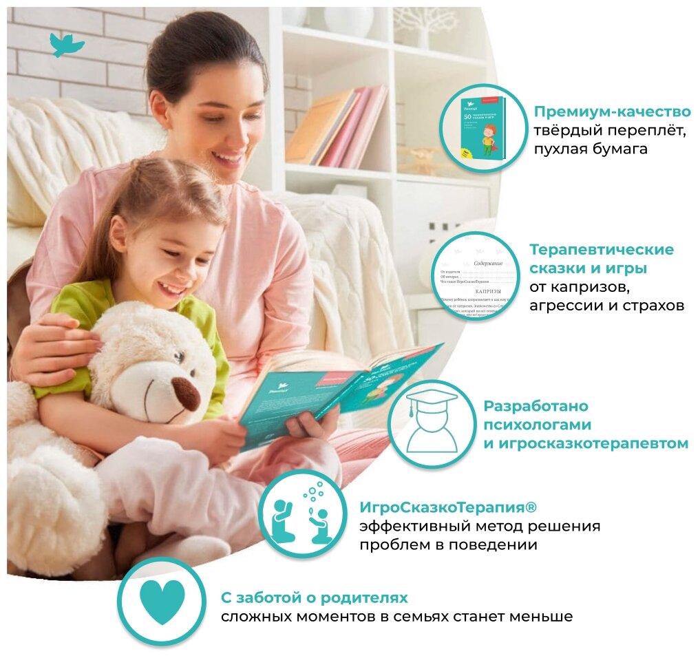 В книге 41 сказка (15 сказок от капризов, 15 сказок от страхов и 11 сказок от агрессии), 9 игр и советы для родителей – всего 288 страниц! Книга напечатана на плотной бумаге высокого качества, в твёрдой обложке.