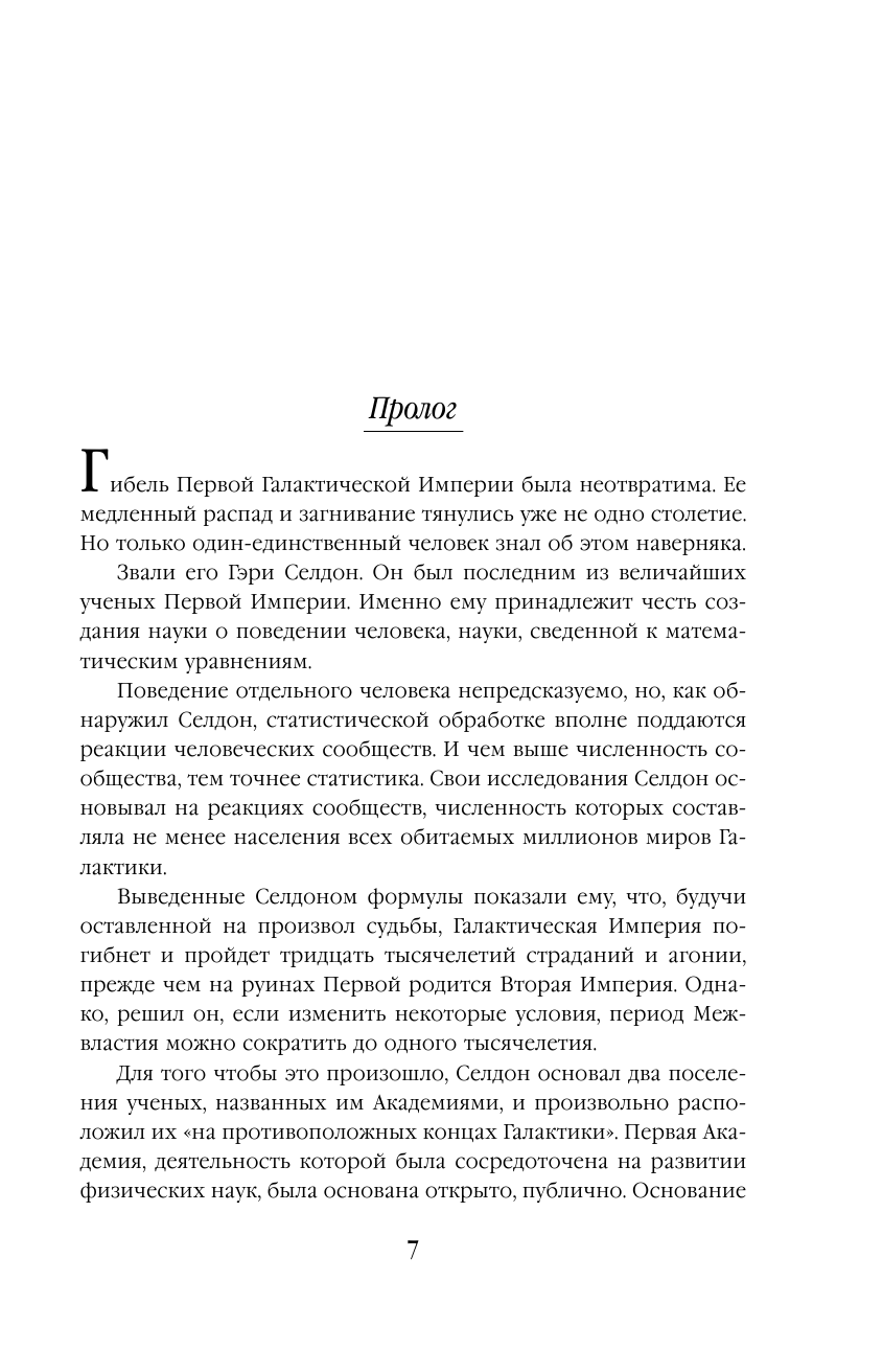 Ученый Гэри Селдон, основатель новой науки - психоистории, в своих работах доказал неизбежность краха Галактической империи, объединявшей миллионы обитаемых миров. Чтобы не допустить падения человечества в пучину надвигающегося хаоса, Селдон разработал детальный план рождения новой Империи на обломках старой. Для осуществления своего Плана Селдон создал в разных концах Галактики две Академии, объединившие лучшие умы человечества. Казалось, ничто не могло помешать осуществлению великого Плана Селдона, но людские амбиции привели к конфликту между Академиями, и человечество вновь оказалось на краю пропасти...