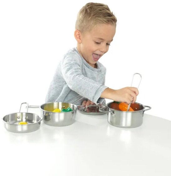 - Малышки будут имитировать приготовление вкусных угощений с помощью кастрюли с крышкой, сотейника и сковороды.