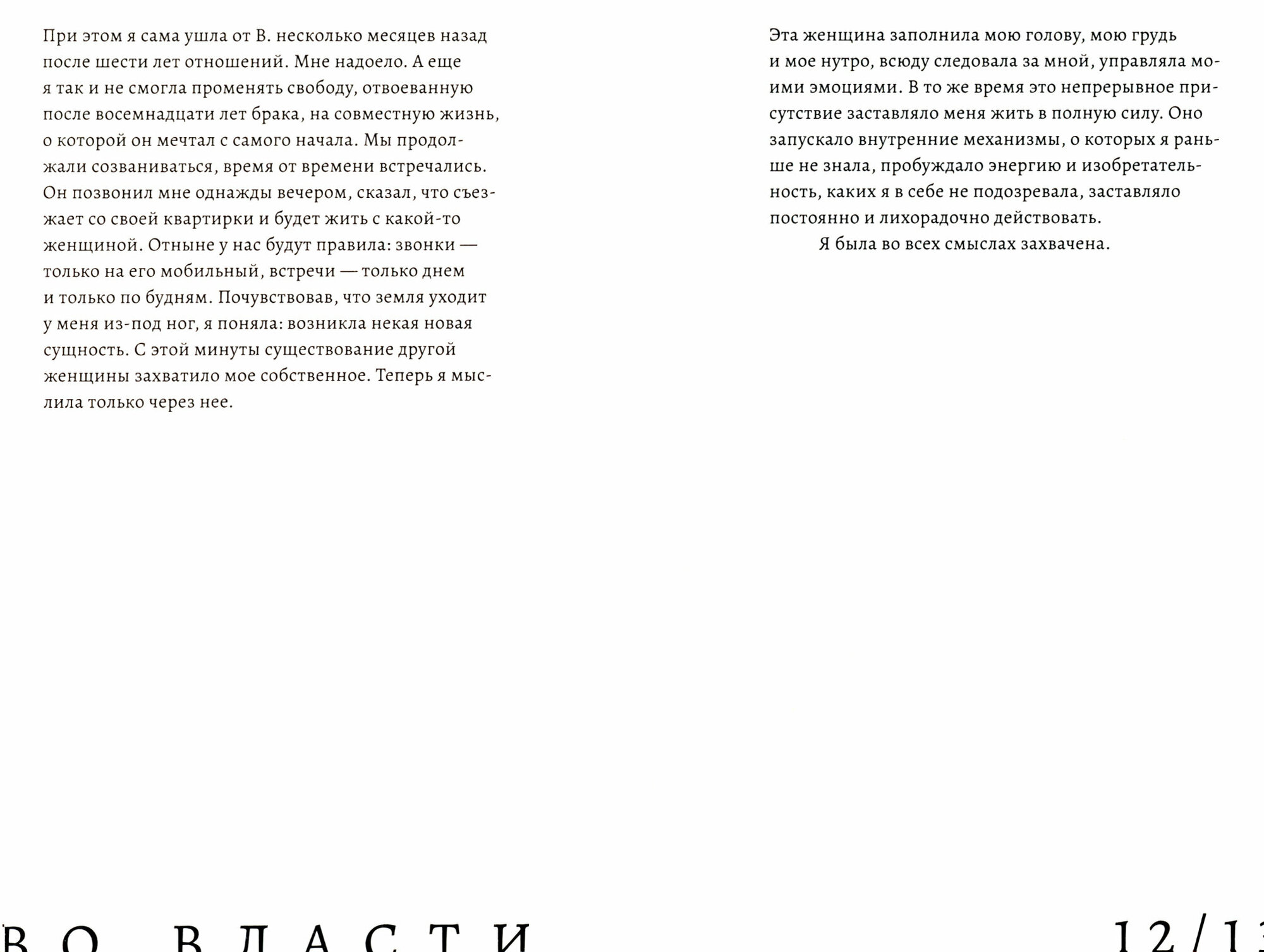 Происходящее в книге Анни Эрно назвала «оккупацией». И действительно, чем ещё является это накатывающая и парализующая смесь ревности, злости и жалости к себе, как не временным захватом тела и разума? Однако неспособность владеть собой не снимает ответственность за совершённые в подобном состоянии поступки, и именно это – один из основных посылов «Во власти». -