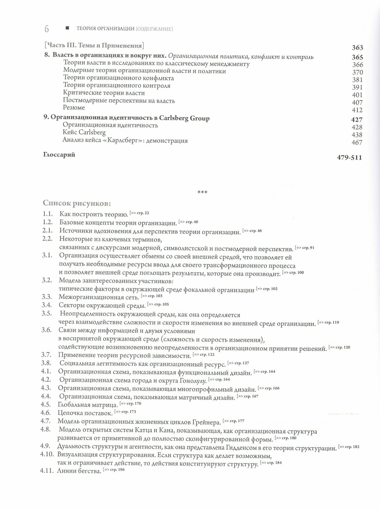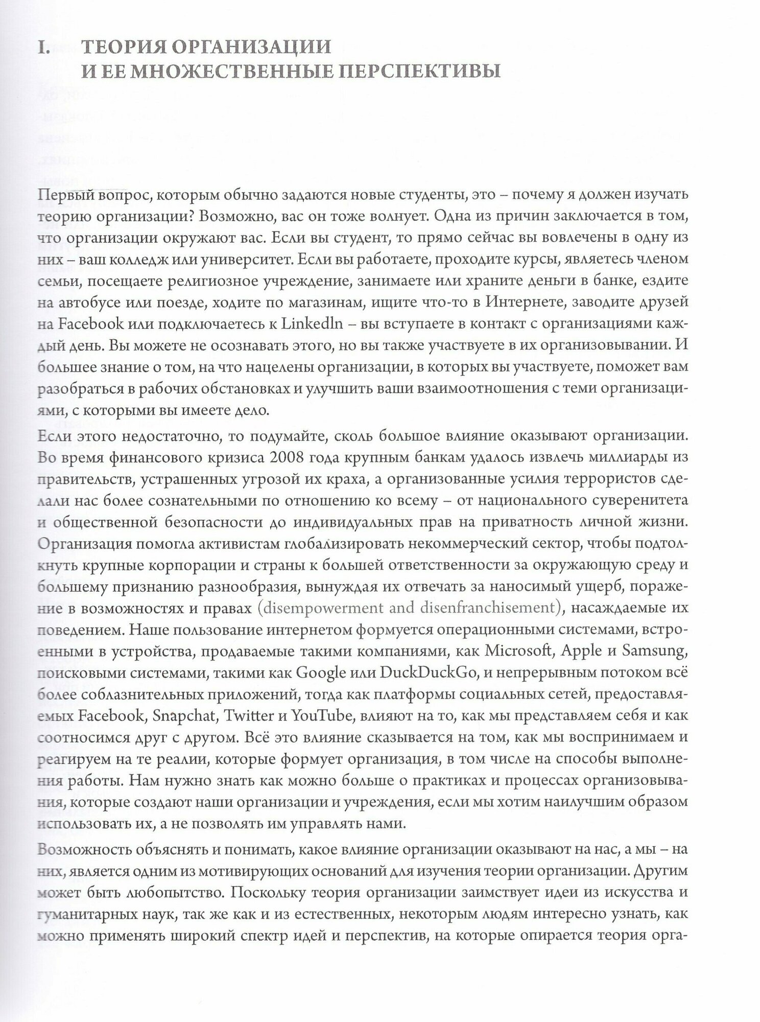 Претендующий на всеобъемлющий характер труд, первое издание которого еще в 90-х. Удобно, но порой поверхностно — сказывается попытка охватить как можно больше ключевых концептов. Значительное количество полезных кейсов, иллюстраций и ссылок. Почти все охвачено. Организация и окружающая среда, структура и технологии, культура и пространство. Особое внимание стоит обратить на главу «Власть в организациях и вокруг них» в которой разбираются как классические, так и современные теории, организационные конфликты и феномен контроля. К сожалению, нужно отметить местами некачественный перевод, снижающий позитивное впечатление от работы.