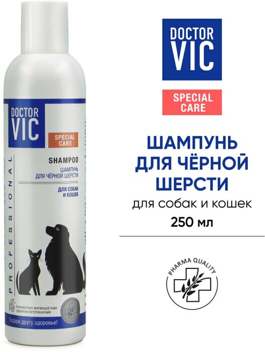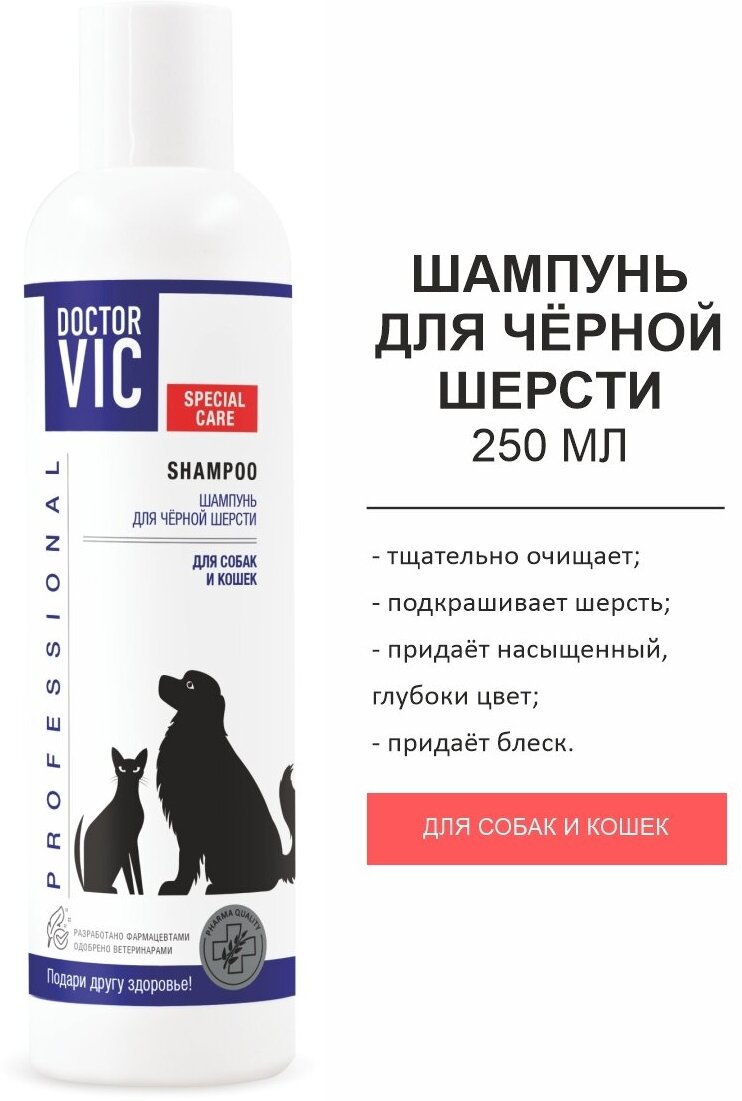 Шампунь для собак и кошек Doctor VIC для черной шерсти, 250 мл. Шампунь для чёрной шерсти собак и кошек. Эффективно борется с бурыми оттенками на чёрном окрасе собак и кошек. При регулярном применении придаёт шерсти тёмных оттенков насыщенный и глубокий цвет, блеск и шелковистость. Шампунь тщательно очищает шёрстный покров и не пересушивает его. Безопасен для животных. Экстракт крапивы, входящий в состав средства, обладает очищающими свойствами, стимулирует обновление шерстно-волосяного покрова, снимает электростатический заряд. Аромат яблока и корицы поднимает настроение, заряжает энергией.1. Шампунь можно разводить водой любой жёсткости.2. Кожно-волосяной покров животного обильно смочите тёплой водой. Небольшое количество шампуня равномерно распределите по всей поверхности тела животного, массируя до образования обильной пены.3. Через 5-10 минут смойте пену тёплой водой, шерсть просушите полотенцем или феном. В случае попадания в глаза обильно промойте водой.Состав: aqua, sodium laureth sulfate, cocamidopropylbetain, sodium chloride, cocamidopropylamine oxide, cocamide dea, panthenol, urtica dioica extract, aesculus hippocastanum extract, propylene glycol, phenoxyethanol, decylene glycol, methylisothiazolinone, ci 60730, ci 20470, parfum.