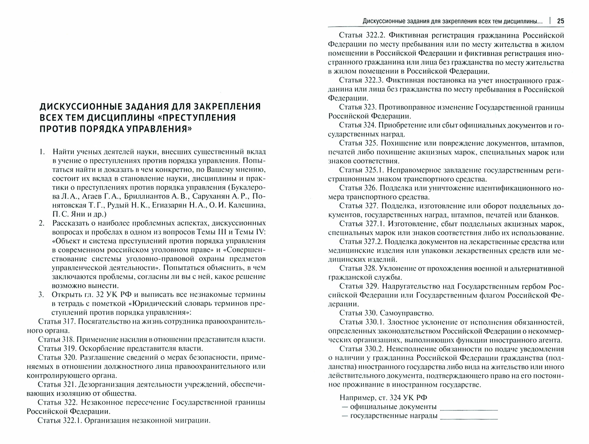 В связи с этим первый раздел содержит перечень общих вопросов уголовно-правовой характеристики указанных деяний, второй - включает в себя задачи, тесты и дискуссионные задания по каждой из пяти представленных тем дисциплины "Преступления против порядка управления". Данное пособие прежде всего предназначено для углубленного изучения ст. 317-330.2 УК РФ раздела X "Преступления против государственной власти".