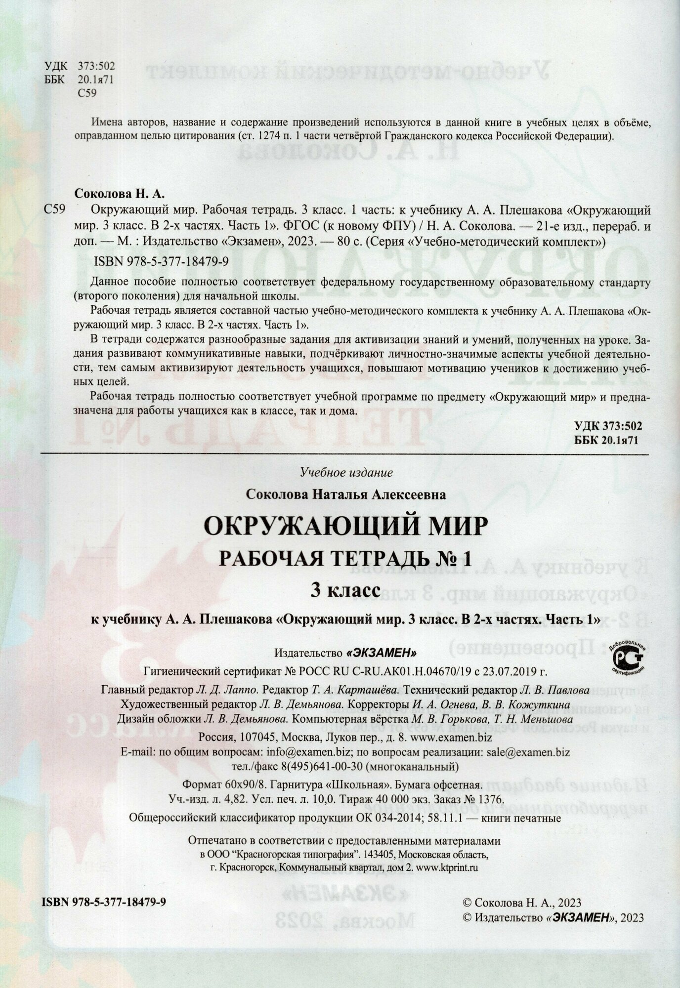 Окружающий мир 3 класс Рабочая тетрадь 1 К учебнику А А Плешакова Окружающий мир 1 класс В 2-х частях Часть 1 М Просвещение (Наталья Алексеевна Соколова); Экзамен, 2024