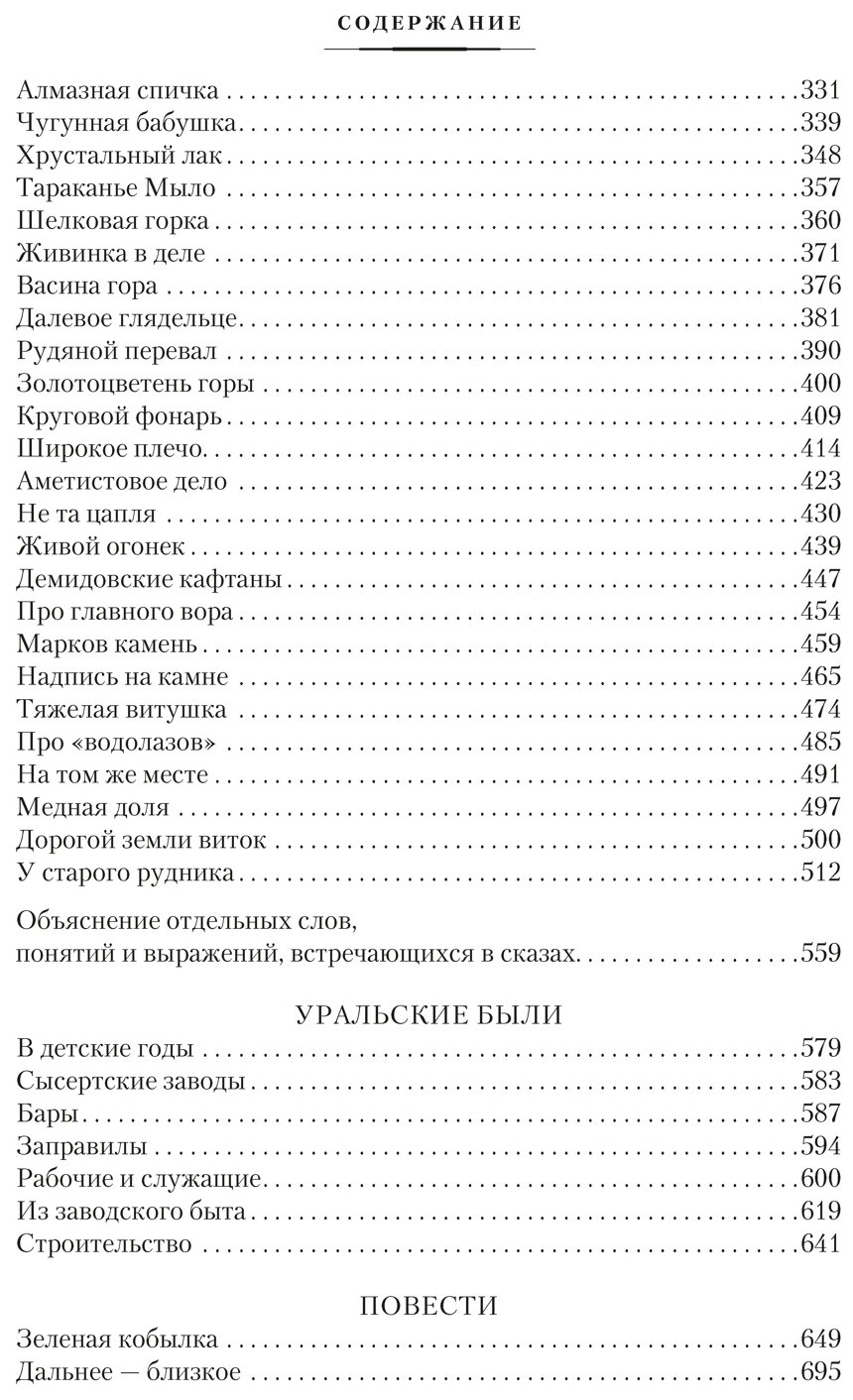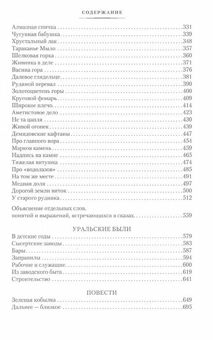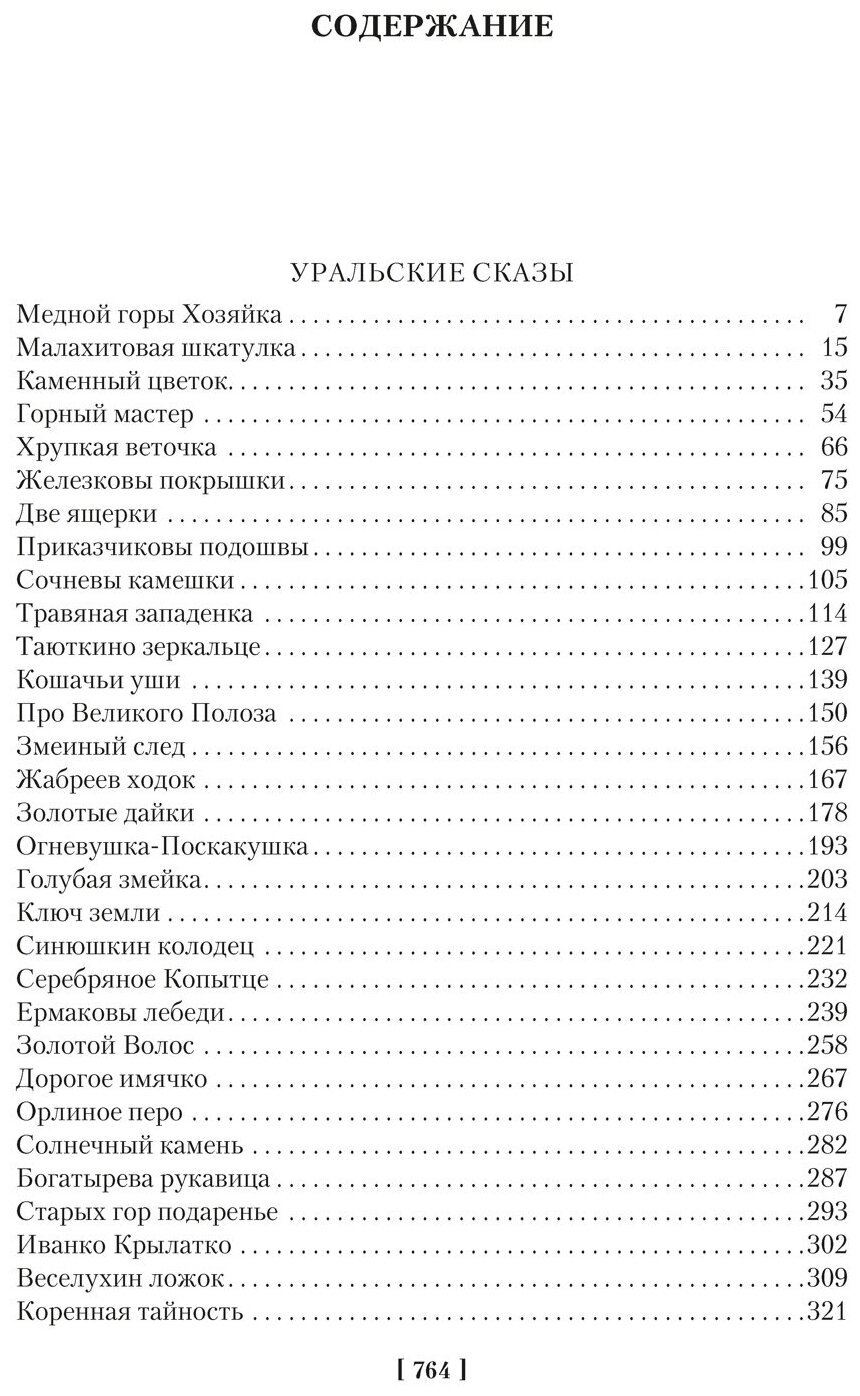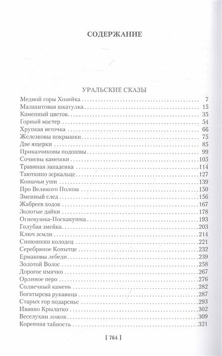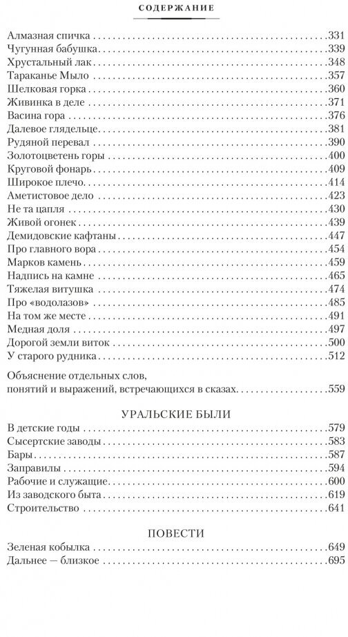 В издание вошло полное собрание уральских сказов П. Бажова: «Каменный цветок», «Малахитовая шкатулка», «Медной горы хозяйка», «Серебряное копытце» и другие, а также автобиографические повести «Зеленая кобылка», «Дальнее — близкое» и сборник «Уральских былей», в основу которых легли воспоминания об уральской жизни и детских годах писателя.