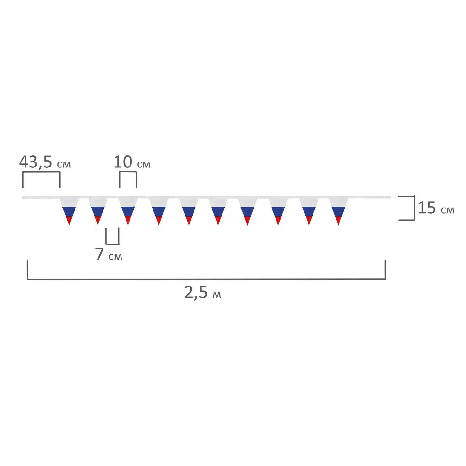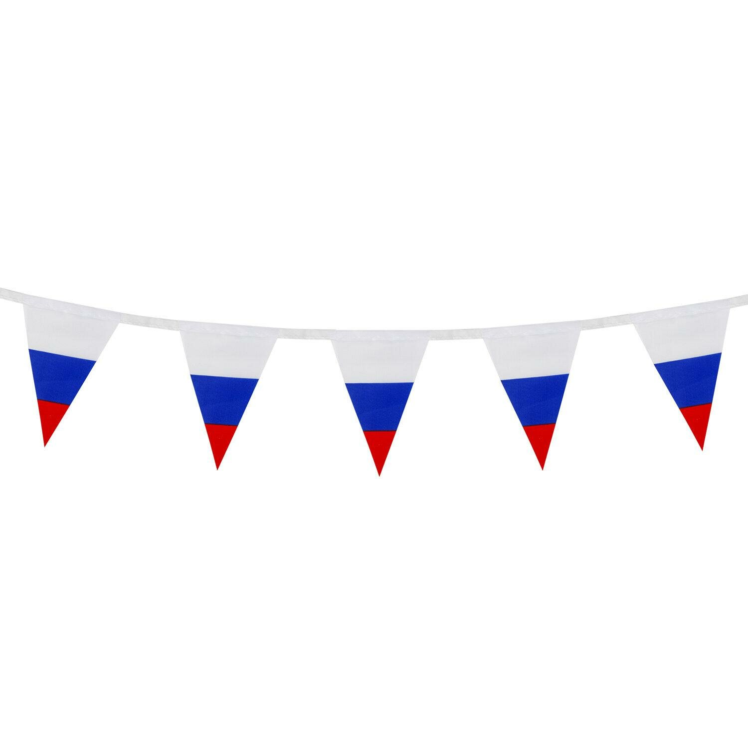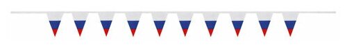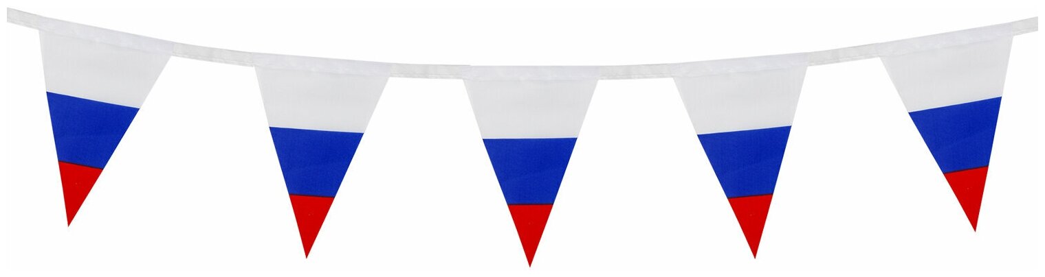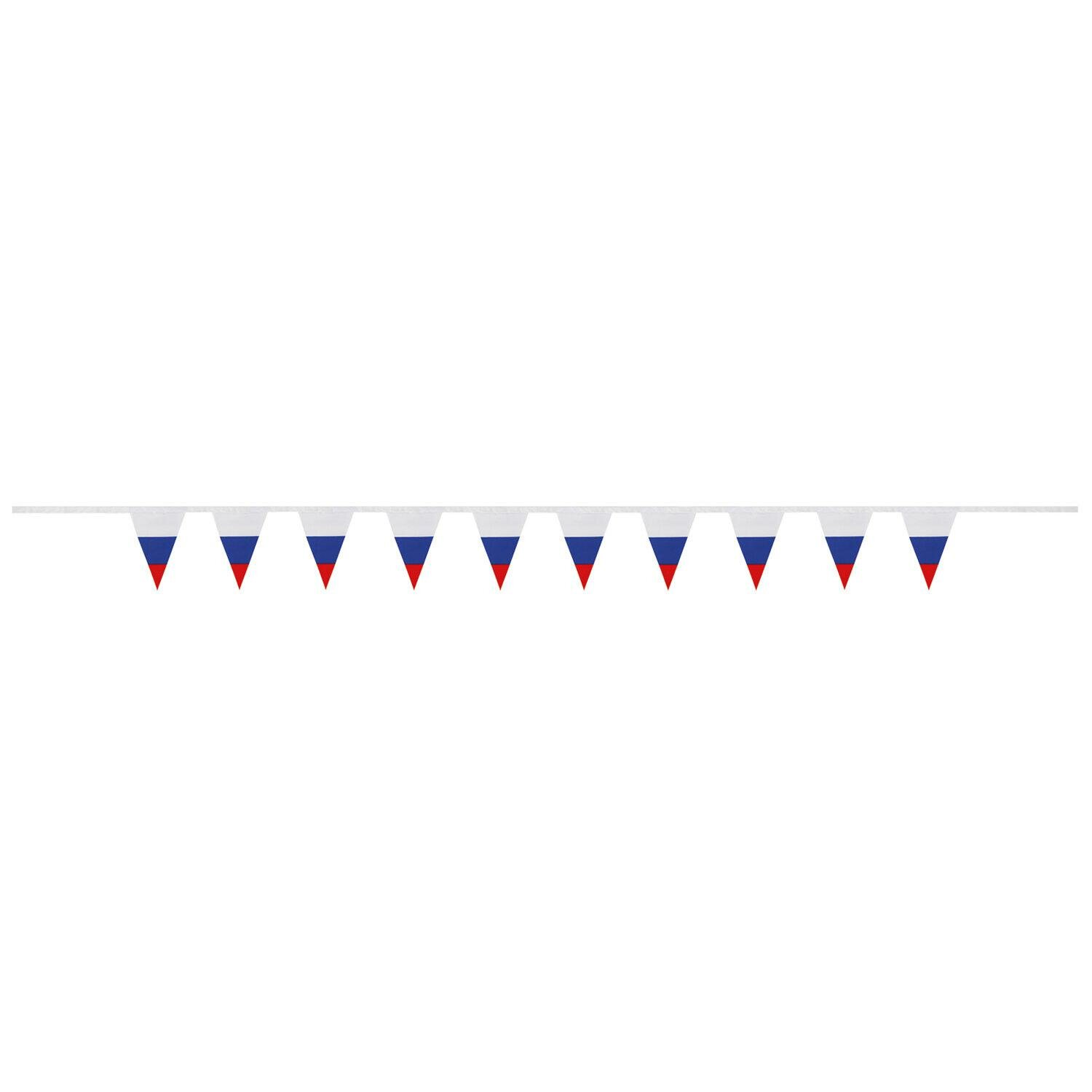 Флаг — официальный символ Российского государства. Гирлянда из флагов России применяется для оформления помещений и зданий, спортивных мероприятий, демонстраций и парадов. Гирлянда состоит из 10 треугольных флажков на ленте, которые выполнены из полиэфирного шелка, в цветах флага Российской Федерации. Размер флажка — 10х15 см, длина гирлянды — 2.5 м. Поставляется в пакете с европодвесом.