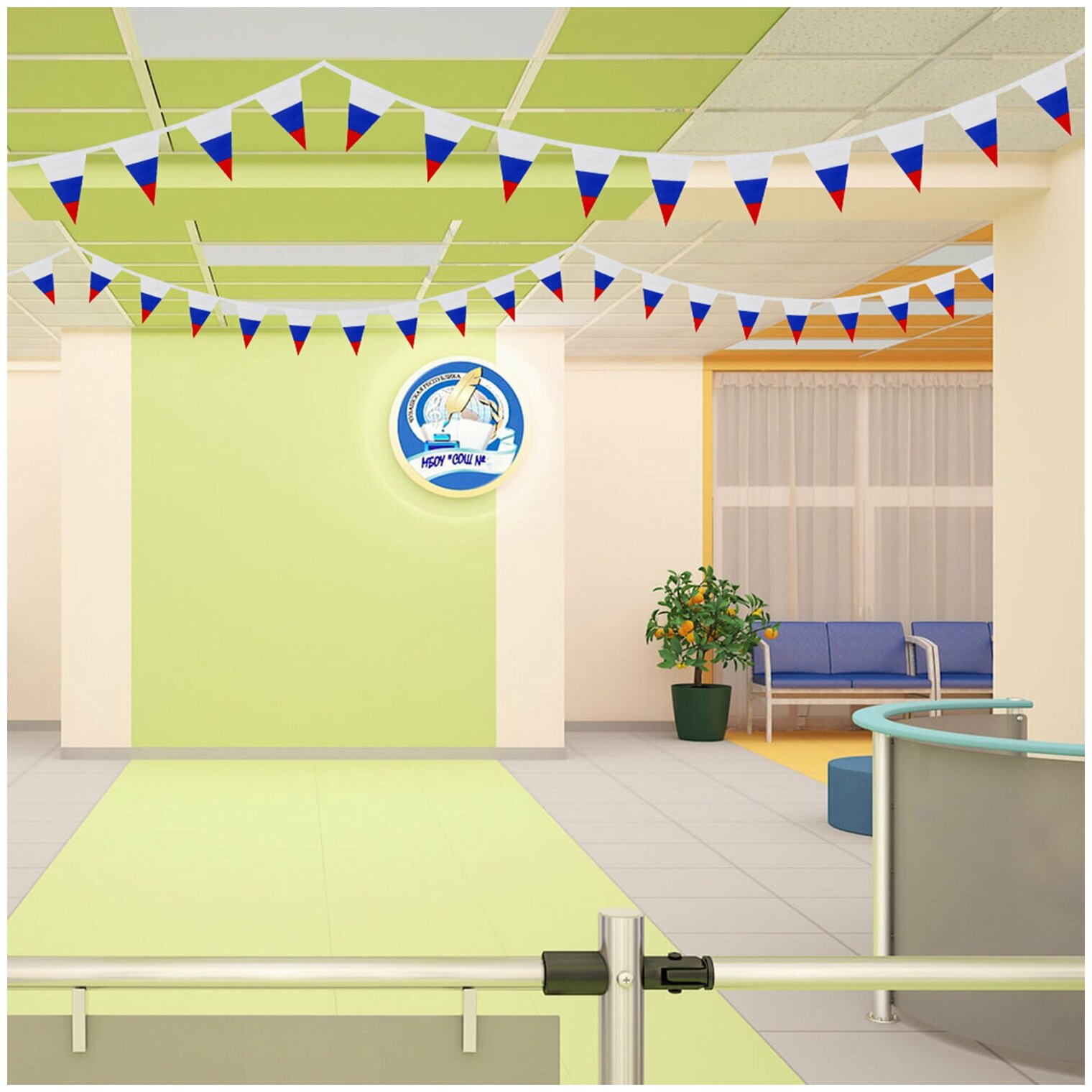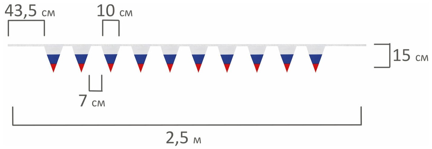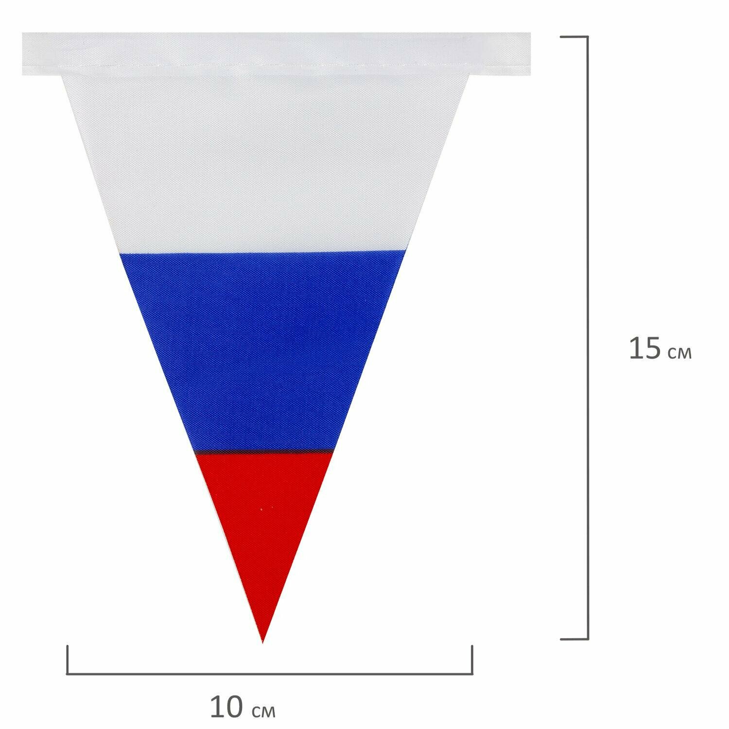 Флаг — официальный символ Российского государства. Гирлянда из флагов России применяется для оформления помещений и зданий, спортивных мероприятий, демонстраций и парадов. Гирлянда состоит из 10 треугольных флажков на ленте, которые выполнены из полиэфирного шелка, в цветах флага Российской Федерации. Размер флажка — 10х15 см, длина гирлянды — 2.5 м. Поставляется в пакете с европодвесом.