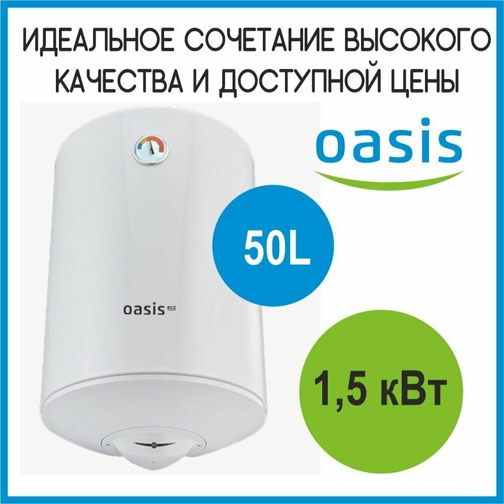 **Электрический накопительный водонагреватель Oasis ** предназначен для обеспечения горячей водой жилых и коммерческих помещений. Температура нагрева воды до 75°C при объёме бака в 50 литров. Потребление электроэнергии устройством не превышает 1,5 кВт.