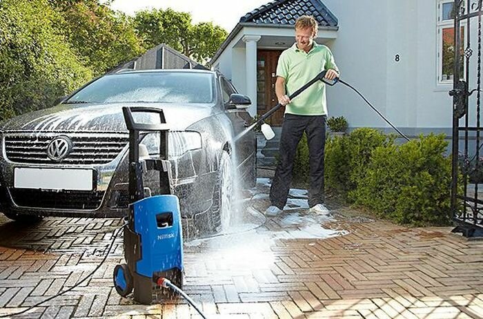 Из первых впечатлений: мощность струи конечно ощущается (при подаче от водопровода), направив на руку-очень больно. Прям на глазах сбивает застывшую грязь с авто. Но,прошелся дважды хорошей химией,и дважды мощной струей и после высыхания-авто в разводах и в налете пыльном. Т.е. мощность не так важна, как умение мыть. Пенная насадка - на первый взгляд неплохо, секунды 2-3 машина вся беленькая, но пена быстро исчезает. Насадки две. Одна как у всех, вторая некая "турбо", кольцеобразной пульсирующей струей бьет, грохот стоит никого рядом не слышно, куски льда ломает. На обычной грязи обе насадки равнозначно справляются. Шланг высокого давления 8 метров, в самом деле, с ним только на машину обойти хватает, если б 5 метров уже не то. Все насадки, шланг, кабель и "иголка" для чистки хранятся на самой мойке, повесил и все унес. Всасывание из бочки: по инструкции шланг не длиннее 3 м и не тоньше 1/2". В магазине рекомендовали 3/4. Отрезал шланг 3/4 на 2 метра - не сосет, чихает, а не сосет. Вставил свой 1/2 метров 5 - заработало. Какая то чувствительность к шлангам, 3/4 вероятно не хватило сил прокачать. Для начала всасывания из бочки также надо отключать сначала шланг ВД. Дождать когда пойдет струя, затем ставить шланг,иначе не заработает, пробовал всяко, и всасывающий шланг заполнял и ведро над головой поднимал.И мощность "из бочки" ощутимо ниже, от струи руке уже не больно. Сам аппарат на неидеально ровной поверхности норовит упасть. В целом аппарат понравился, ощущения приятные, мыть понравилось. Но щеточку для мытья на чистовую поиметь надо будет. А где щеточка - возникает вопрос так ли важна мощность?Достоинства: