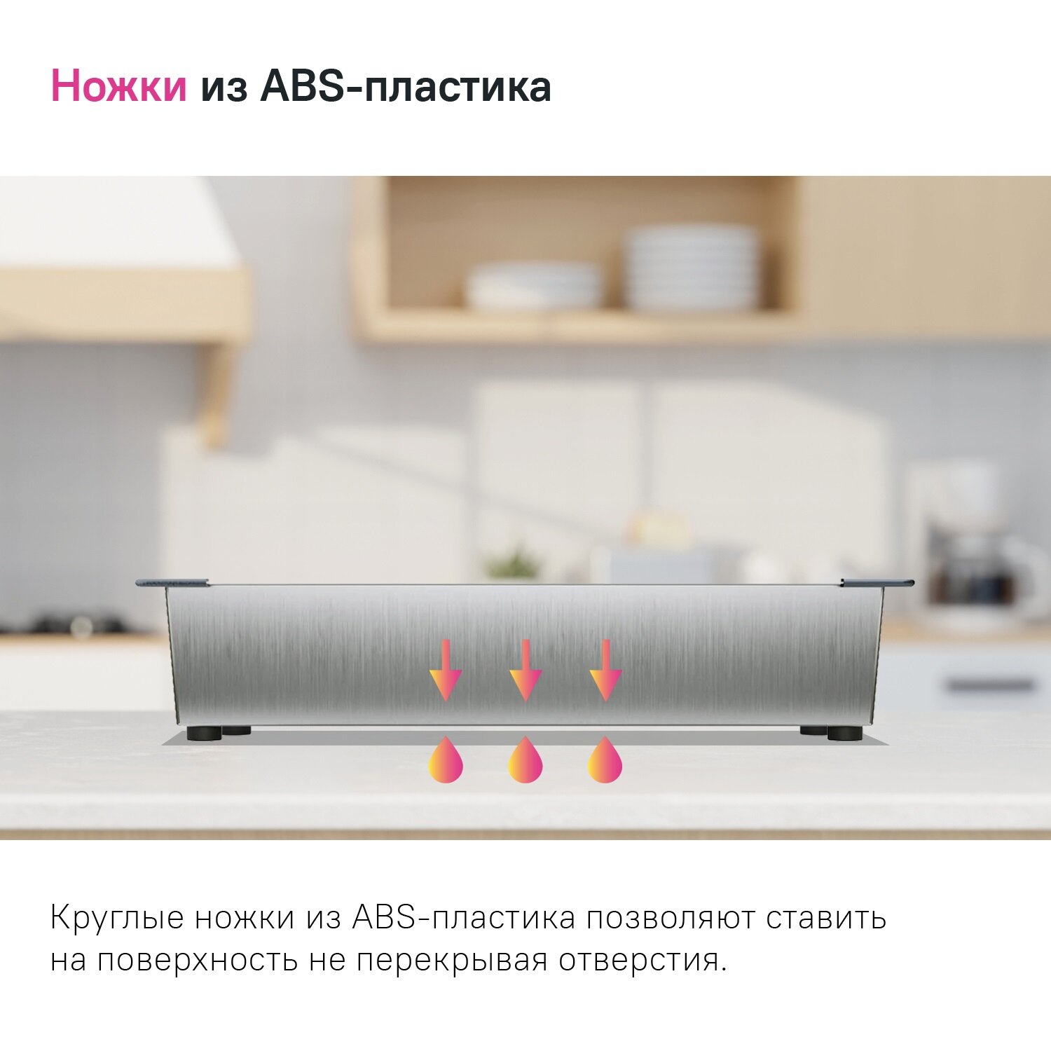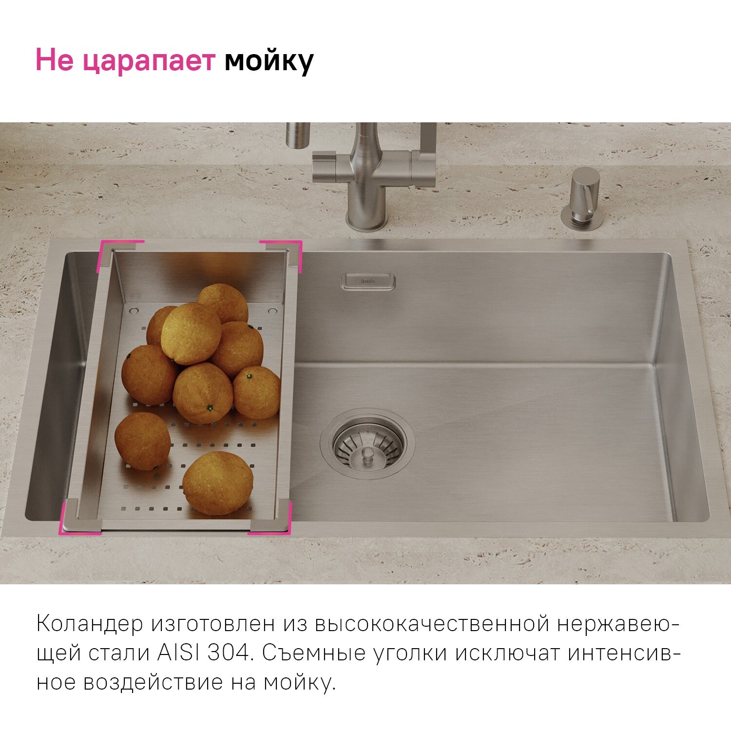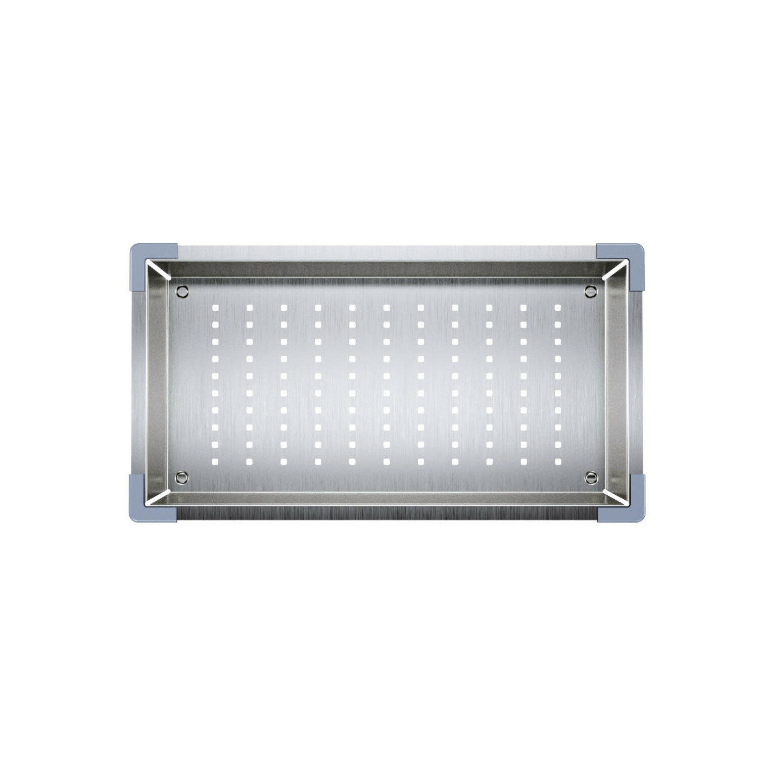 Коландер из коллекции кухонных аксессуаров Kitchen Line отличается современным дизайном и особой ручной технологией производства, что позволяет добиться идеальной геометрии – малый радиус закругления углов увеличивает и без того вместительное рабочее пространство. Благодаря небольшим отверстиям, расположенным на дне изделия, его можно использовать как дополнительную рабочую поверхность: для разморозки и хранения продуктов, ополаскивания овощей и фруктов, сушки посуды и столовых приборов. Коландер Kitchen Line – универсальный аксессуар, который впишется в любой дизайн интерьера и подойдет практически к любой мойке с длиной чаши от 40 см. Он станет отличным дополнением к кухонным мойкам из популярных коллекций Edifice, Haze и Reeva. В комплекте 2 набора съемных уголков из черного и серого ABS-пластика.• Аксессуары для кухни IDDIS® изготовлены из высококачественной нержавеющей стали AISI 304, которая не боится ни бытовой химии, ни царапин. • Коландер имеет круглые ножки из ABS-пластика, которые позволяют не только вешать его на мойку, но и ставить на поверхность (на дно мойки, на стол) не перекрывая отверстия. • Гарантия на кухонные аксессуары IDDIS® – 2 года.