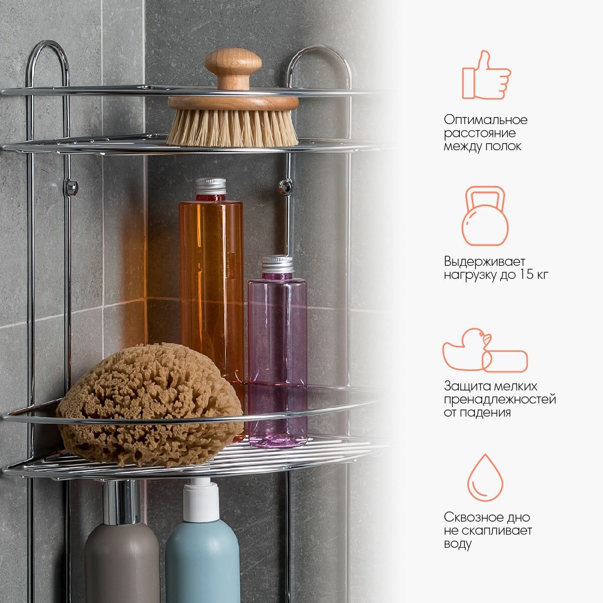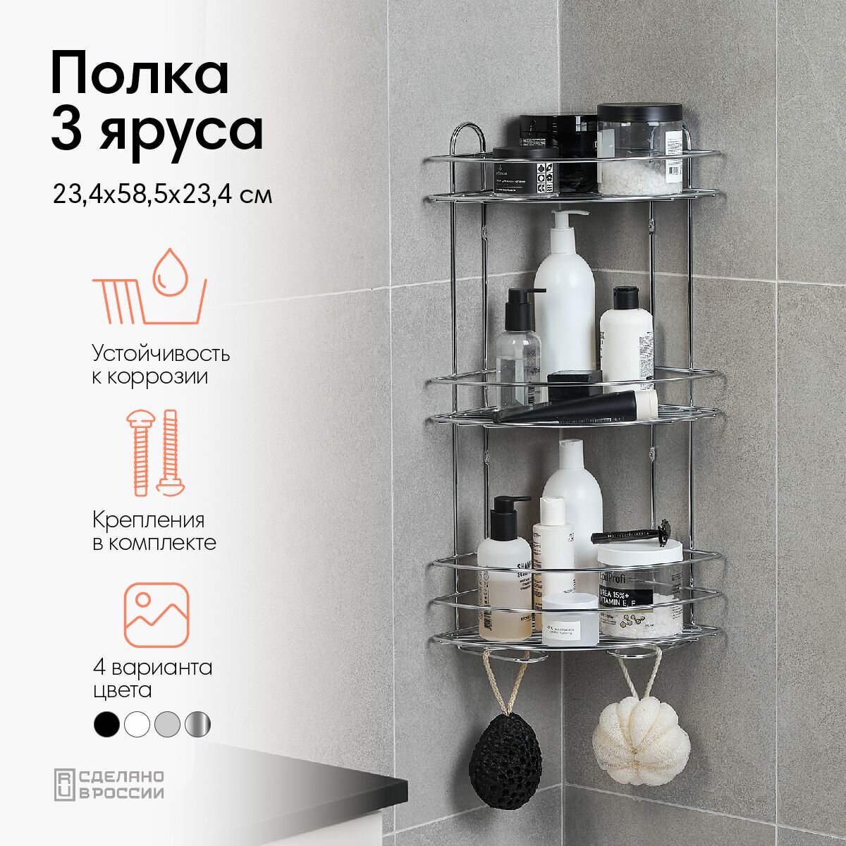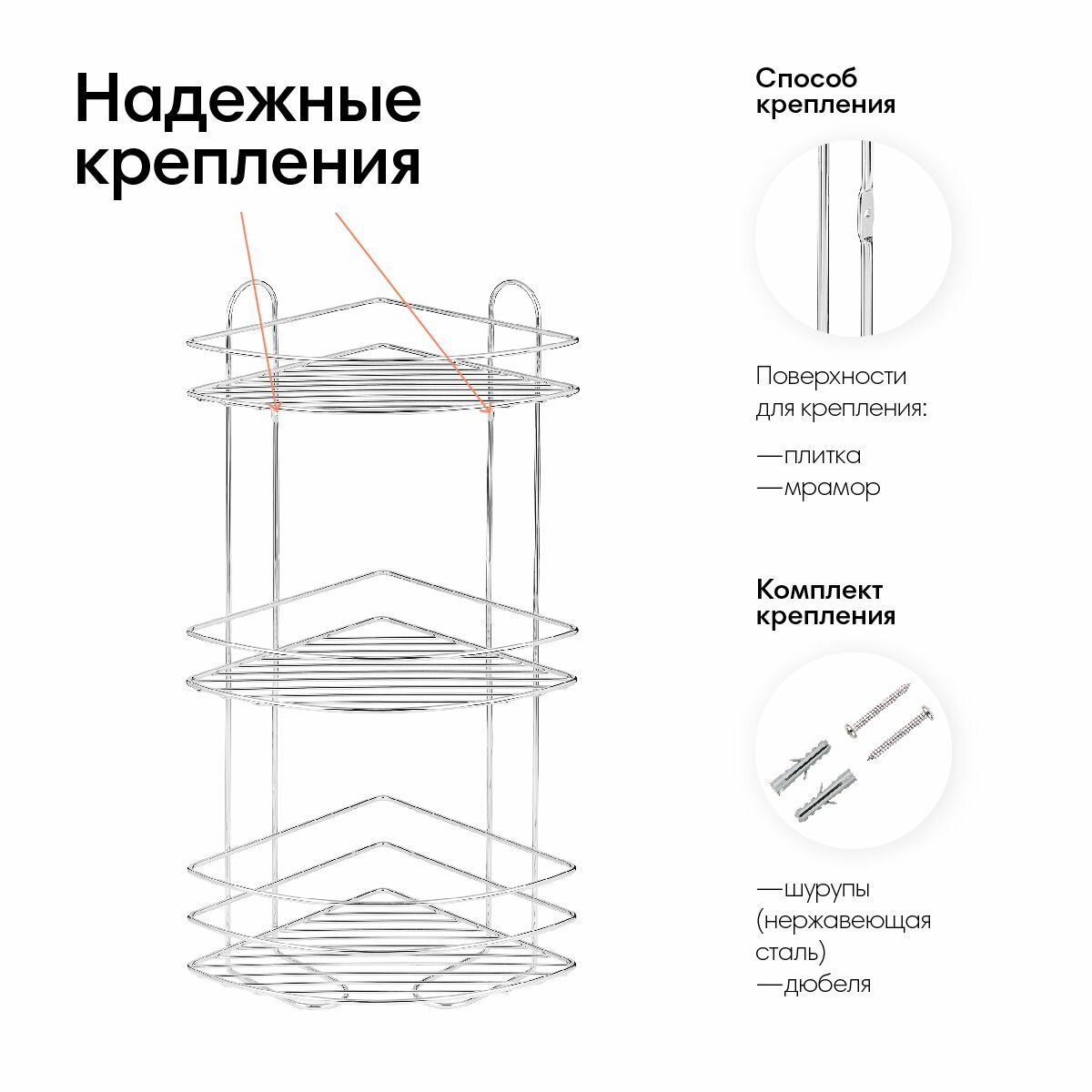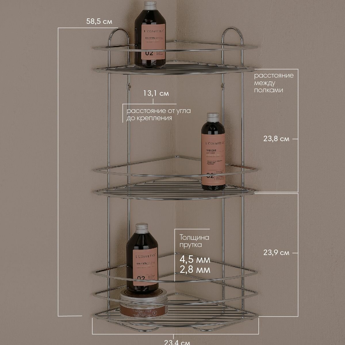Угловая полка для ванной от бренда ЧМЗ - стильный аксессуар для грамотной организации пространства в ванной комнате. Трехъярусный органайзер из стального материала с нержавеющим антигрибковым покрытием выдерживает вес в 20 кг. Изделие выполнено в удобном для углового подвешивания размере: общая высота 58,5 см, ширина боковой части 23,4 см. Расстояние между полками - 23,9и 23,8 см. Расстояние от угла до крепления - 13,1 см. Модель в стиле лофт предполагает крепление на саморезы с дюбелем (2 штуки), с фурнитурой в комплекте из нескольких предметов (шайбы и колпачки). На конструкции присутствуют усиленные крючки для мочалок. Вместительная полка из стали сочетается с любым интерьером ванной комнаты. Высокие бортики не позволят упасть сосудам с уходовой косметикой, а металлические прутки разного диаметра - 4.5 мм и 2.8 мм продляют срок использования изделия. Для сохранения безупречного внешнего вида полки при уходе за ней рекомендуется использовать щадящие моющие средства и мягкую салфетку.