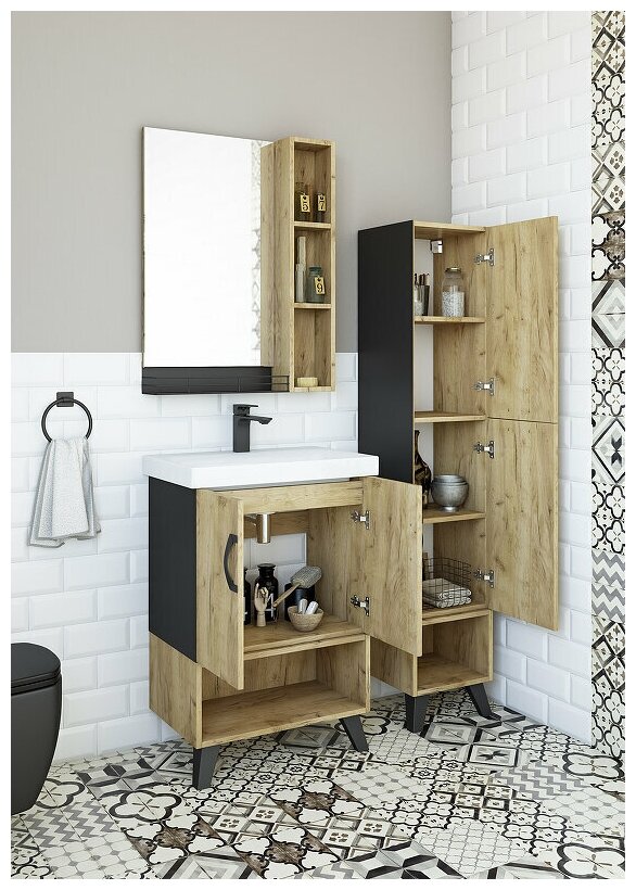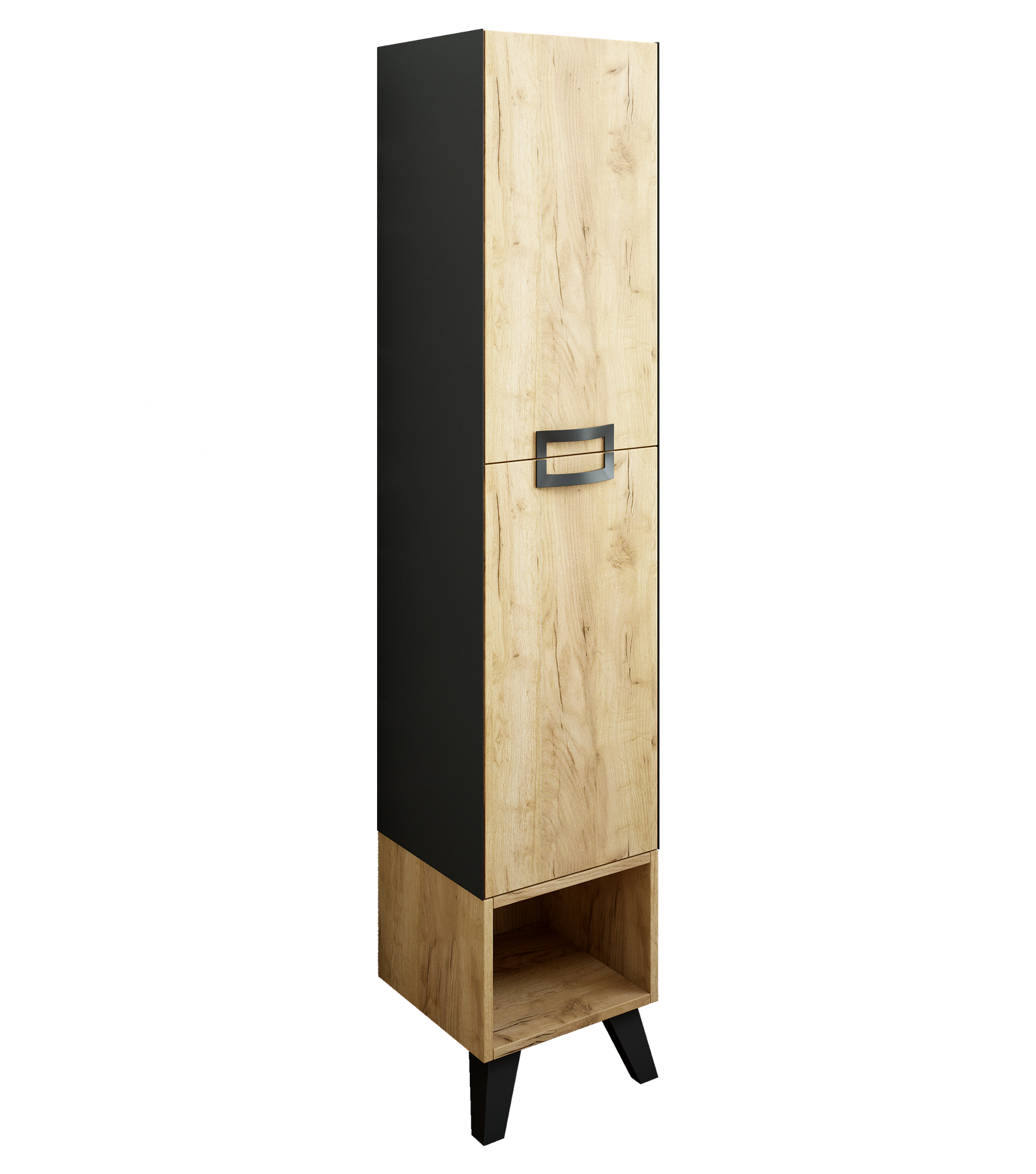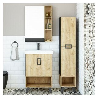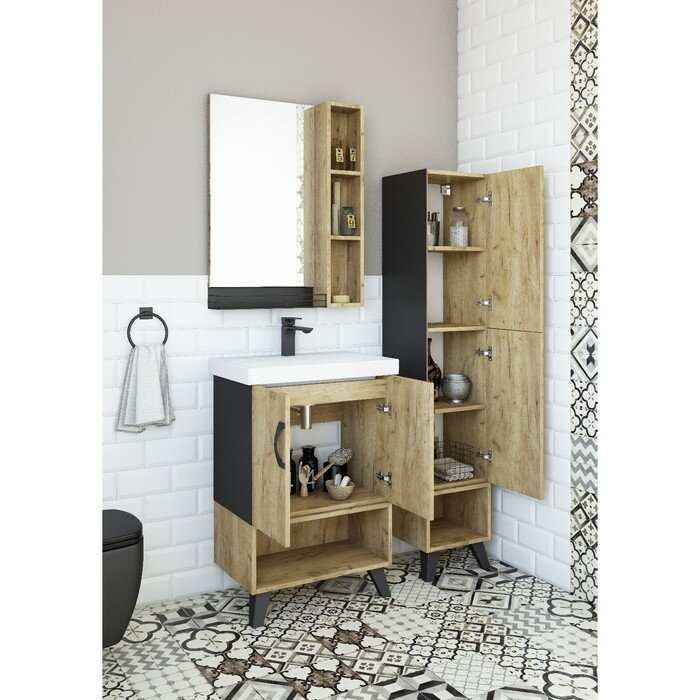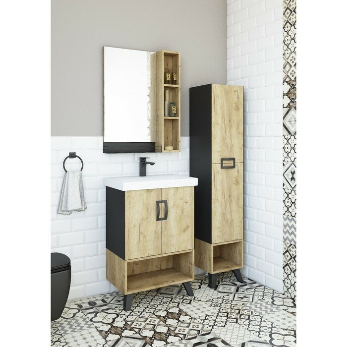 Цвет фасада: дуб крафт золотой. Цвет корпуса: черный. Материал: влагостойкая ЛДСП. Покрытие: матовое. Цвет фурнитуры: черный. Ориентация: универсальная. В комплекте поставки: пенал, крепления, ножки