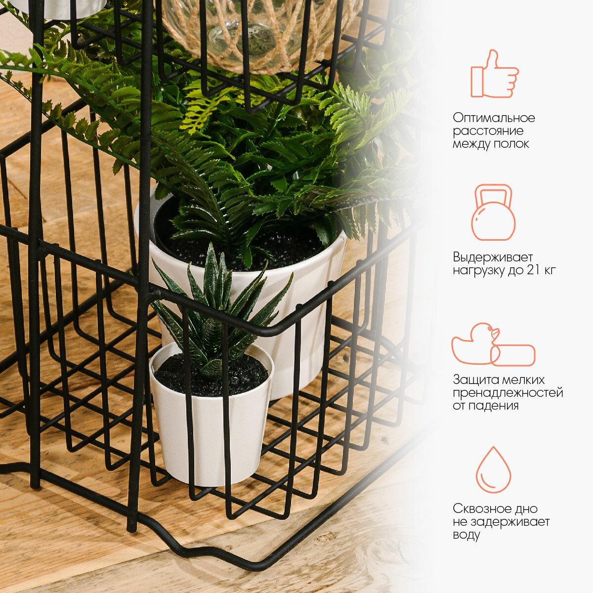 Стеллаж напольный трёхуровневый. Сделан из прочной стали чёрного цвета. Изделие не ржавеет, выдерживает до 20 кг и не деформируется. Верхее защитное покрытие предотвращает от появления царапин и трещин и обеспечивает долгий срок службы. Российское производство гарантирует надёжное качество. Три яруса позволяют разместить на стеллаже большое количество вещей, создавая комфортную систему хранения. Полки стеллажа выполнены в виде небольших корзинок и станут оригинальной деталью интерьера. Гарантия 2 года.