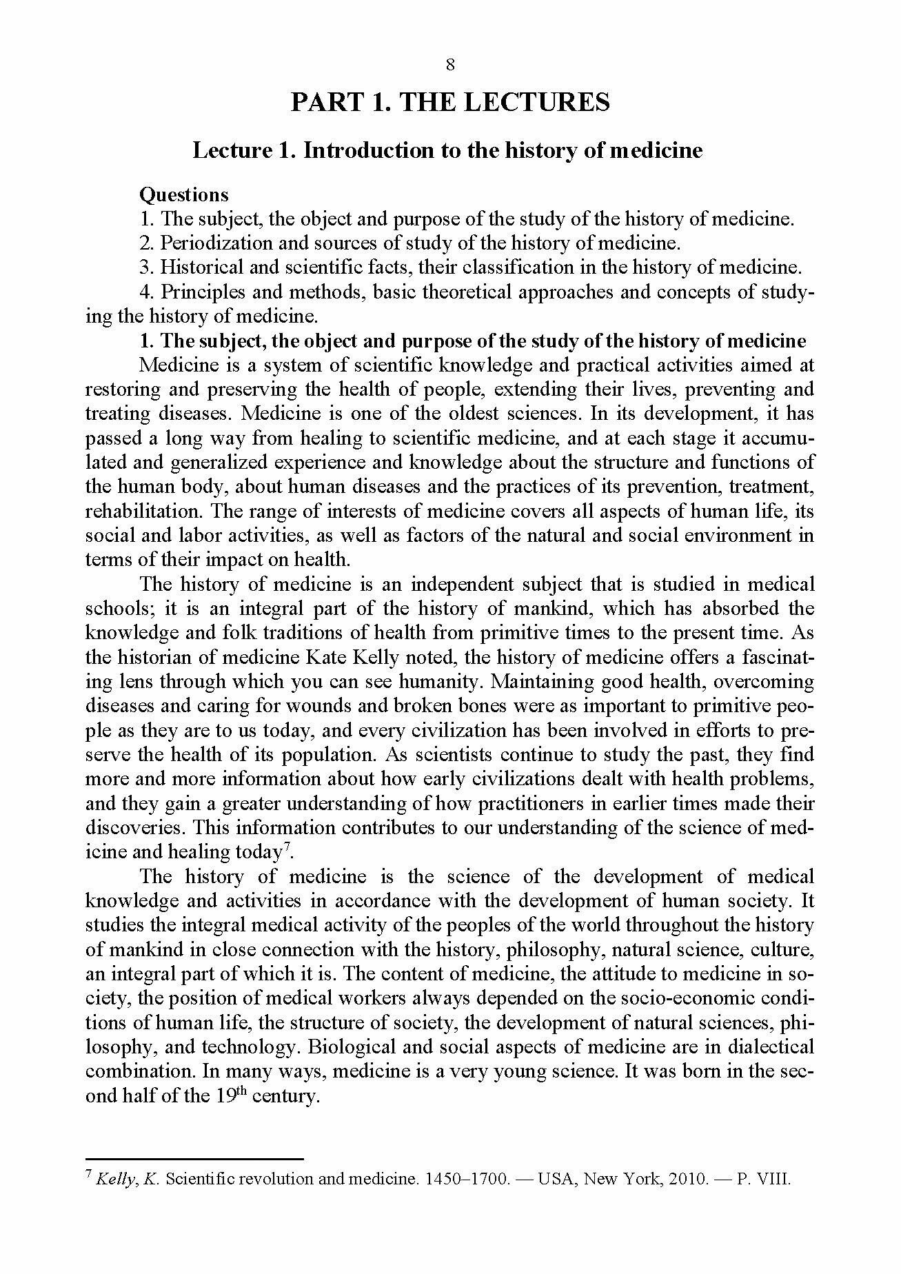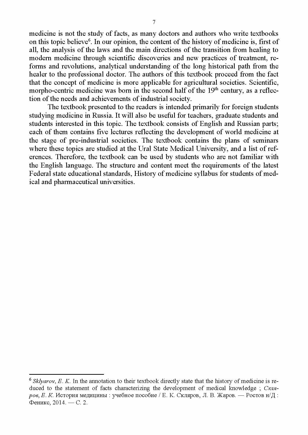 The textbook is intended for foreign students studying medicine in Russia. Its novelty is that the authors analyze the history of medicine from the standpoint of the civilizational approach, give the characteristics of eras. The general laws and features of the development of healing of this culture and people are derived in accordance with the characteristics of civilizations. Social subjects of medicine are presented in separate paragraphs on relevant topics. The textbook consists of English and Russian parts; each of them contains seven lectures reflecting the development of world medicine at the stage of pre-industrial societies. The textbook contains the plans of seminars where these topics are studied at the Ural State Medical University, and a list of references. Therefore, the textbook can be used by students who are not familiar with the English language. It will also be useful for teachers, graduate students and students interested in history of medicine. The English text is illustrated.