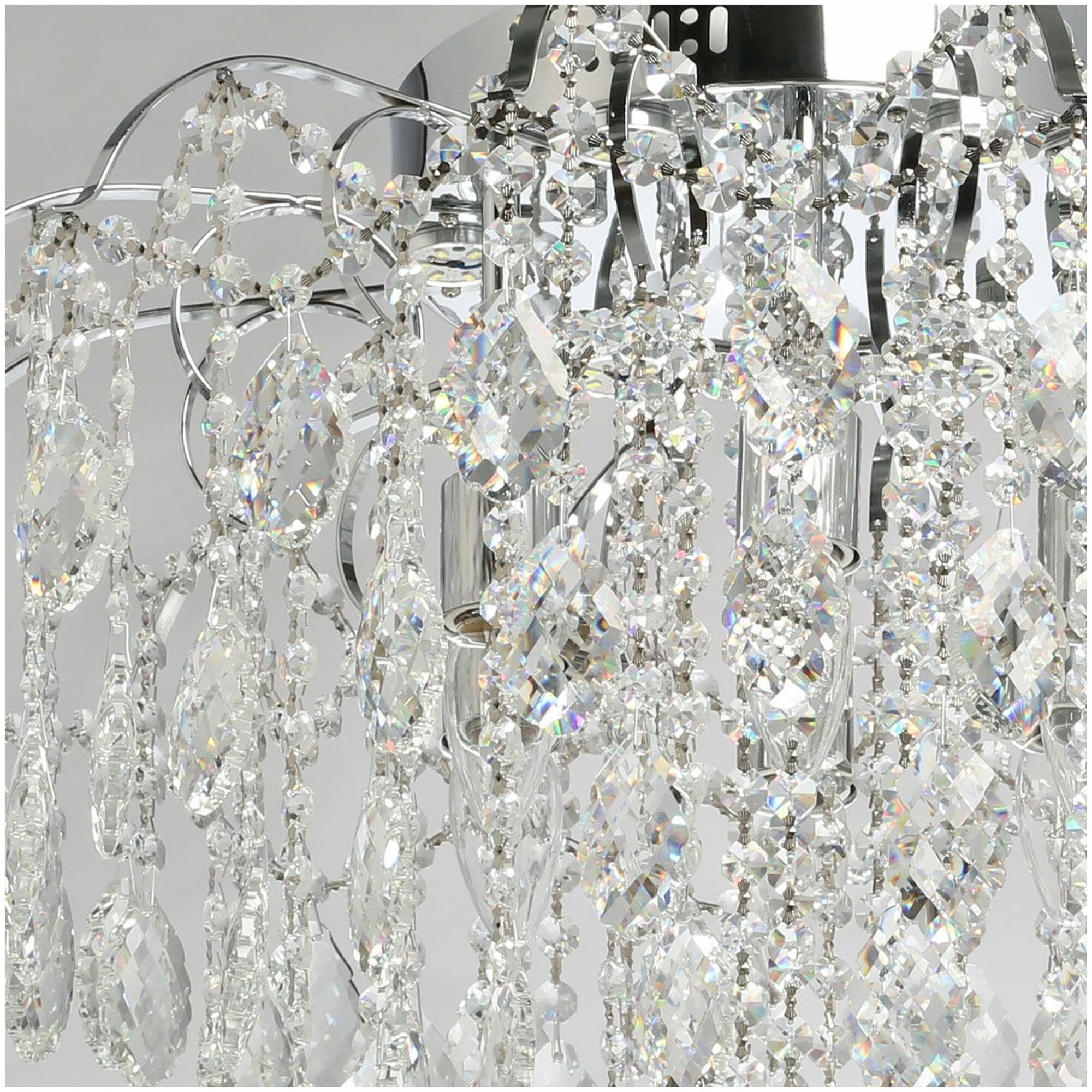 Металлическое основание гальванизировано в цвет хрома. Светильник декорирован прозрачным хрусталем в форме резных листьев и октагонов.