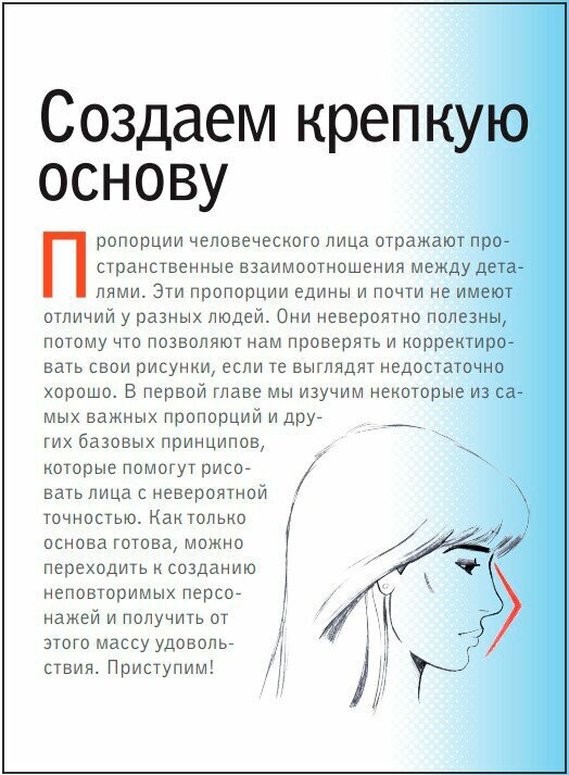 Вот уже несколько дней, как я являюсь счастливым (а может и не очень, сама пока до конца не разобралась) обладателем данной книги, и все еще пребываю в замешательстве. Начинается книга с самых общих сведений о создании лица и отдельных его элементов, затем о том, как с помощью них изобразить разные эмоции и завершается примерами разных причесок. И все вроде бы ничего, но не совсем понятно, для кого эта книга все-таки предназначена. Она явно не для новичка, который вообще ничего не знает (база здесь весьма поверхностная), но и человек с достаточно высоким навыком рисования в ней едва ли найдет что-то полезное для себя. Вот и получается, что подойдет она только для небольшого числа самоучек вроде меня, у которых пробел именно в создании эмоций