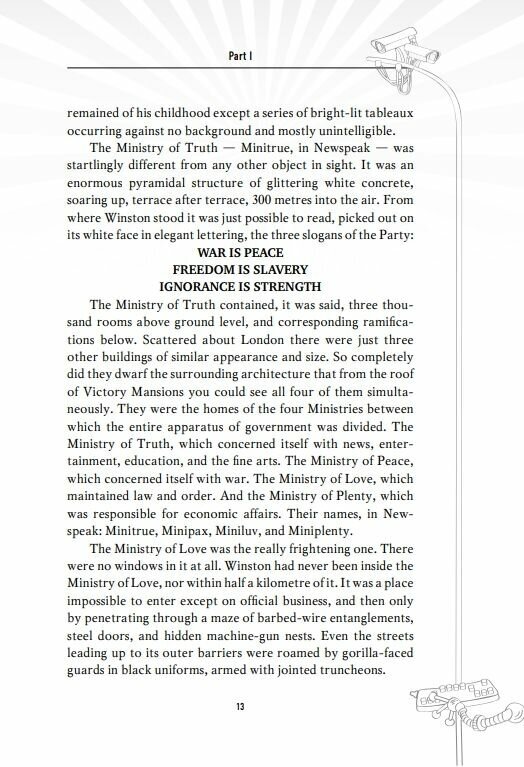 Читайте роман в оригинале, восхищайтесь изобретенными Оруэллом словами и понятиями и совершенствуйте свой английский. Настроение книги подчеркивают стильное оформление и черно-белые иллюстрации. Ведь в мире Оруэлла нет ни оттенков, ни полутонов - только свои или чужие, враги или союзники, черное или белое.