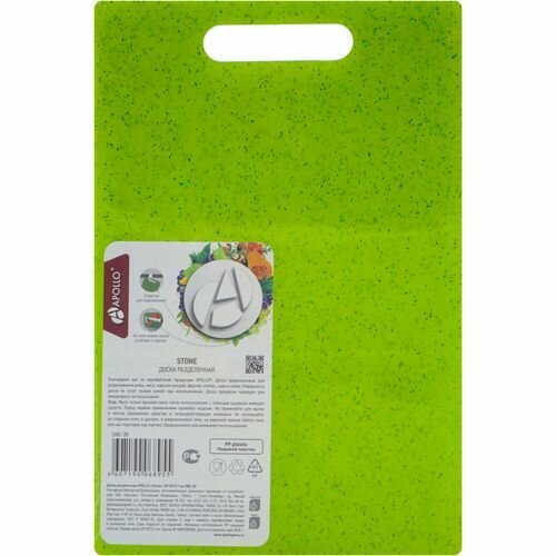 Технология. Благодаря особой технологии производства, доски имеют необычный окрас, а-ля под камень. Подвес. На досках есть отверстие для подвешивания. Так же за него проще поднимать доску со стола. Цвет. 2 цвета на выбор. Белые доски идеально подойдут к столешницам под мрамор, а прозрачно-зеленые отлично впишутся в любой современный интерьер. Материал изготовления: пищевой пластик. Упаковка: термоусадочная пленка. Товар представлен в ассортименте: 2 цвета.