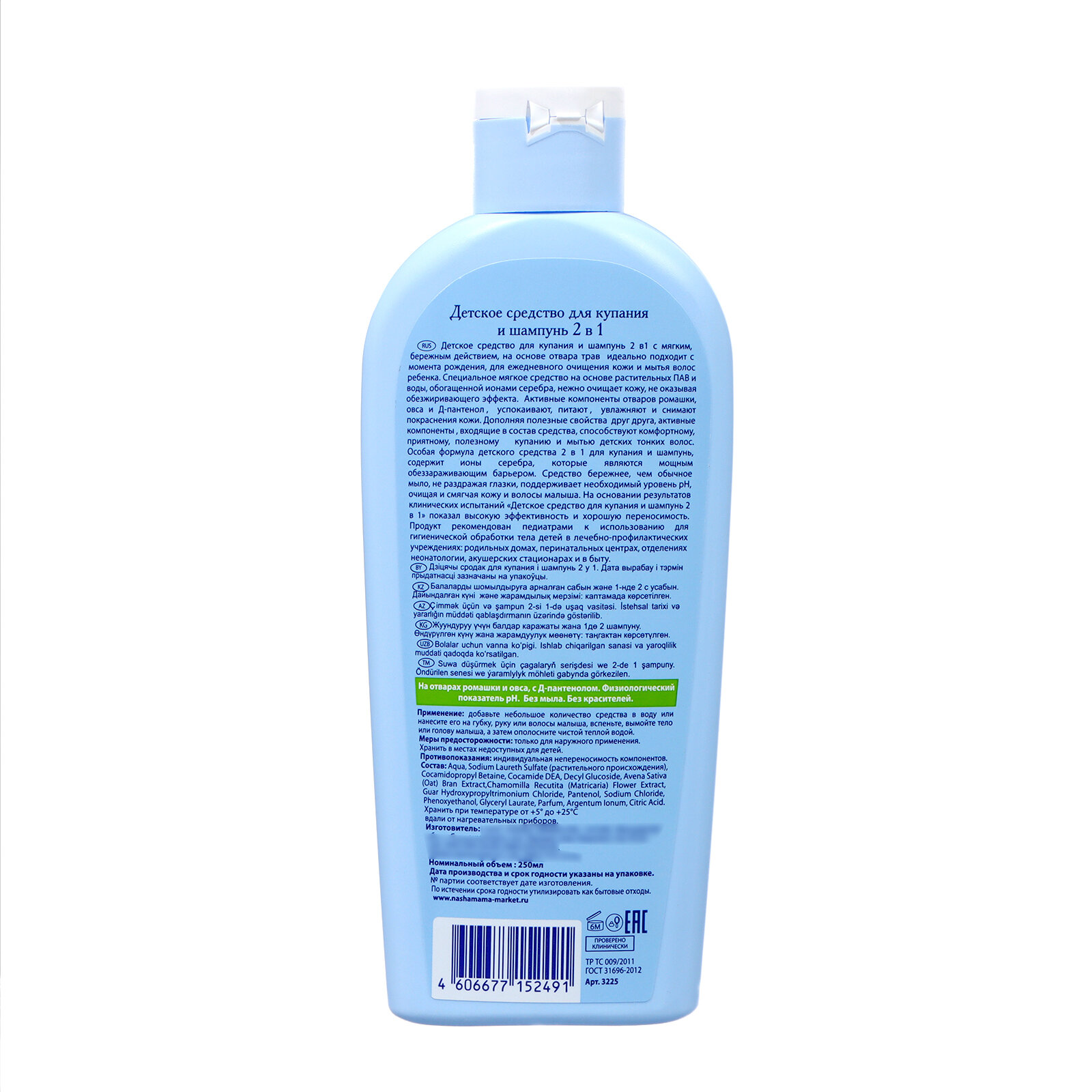 | Состав | Aqua, Sodium Laureth Sulfate (растительного происхождения), Cocamidopropyl Betaine, Cocamide DEA, Decyl Glucoside, Avena Sativa (Oat) Bran Extract, Chamomilla Recutita (Matricaria) Flowеr Extract, Guar Hydroxypropyltrimonium Chloride, Pantenol, Sodium Chloride, Phenoxyethanol, Glyceryl Laurate, Parfum, Argentum Ionum, Citric Acid |