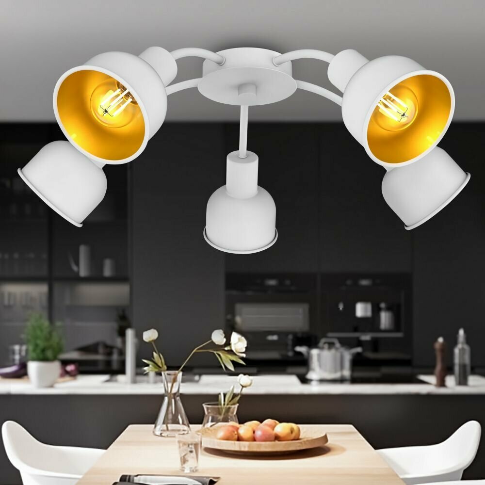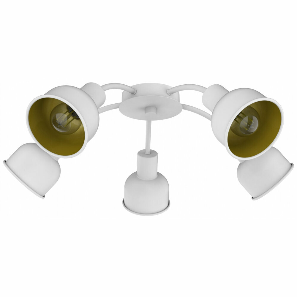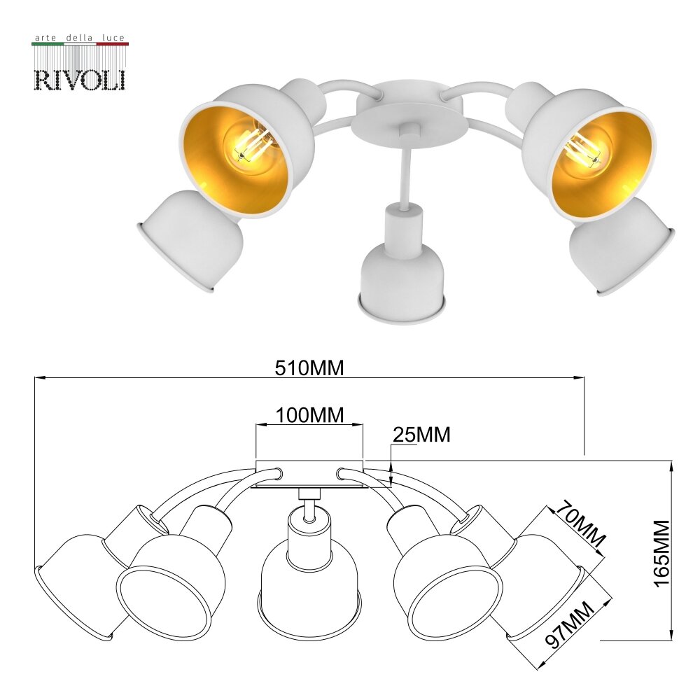 Rivoli Esmeree (арт. 7056-735) - люстра на потолок с 5 трендовыми металлическими плафонами. Внешняя сторона плафонов имеет белое матовое покрытие, внутренняя - покрытие золотого цвета. Люстры потолочные Esmeree - прекрасное интерьерное решение для популярного стиля лофт. Дизайн создан итальянским брендом Rivoli, известным в России за оптимальное сочетание цены и качества.