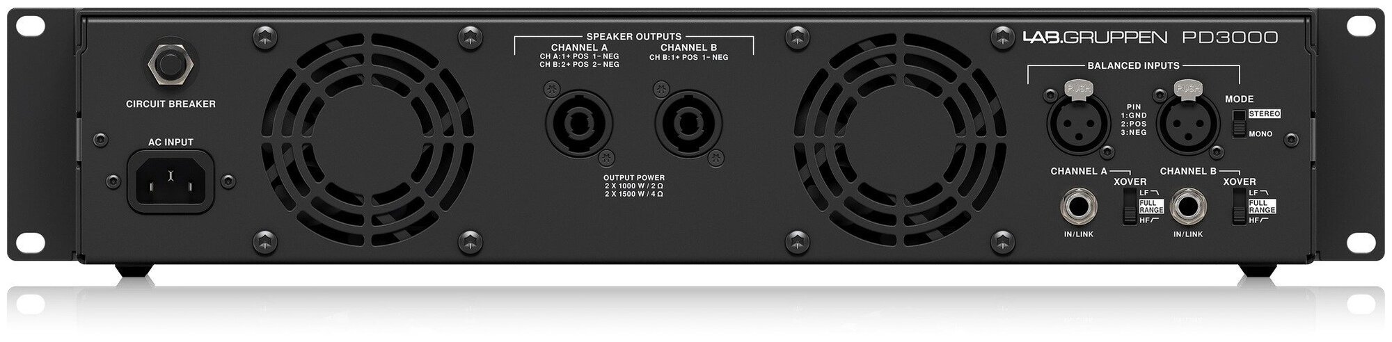 Lab.gruppen - это двухканальный усилитель мощностью 2 х 1500 Вт. Усилитель имеет комплексную защиту цепи, защитит подключенные пассивные мониторы и усилитель от короткого замыкания, всплесков напряжения и тепловой перегрузки. Для каждого входа имеется свитч XOVER, он включает НЧ или ВЧ фильтр или отключает его.