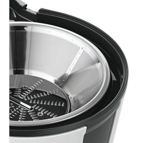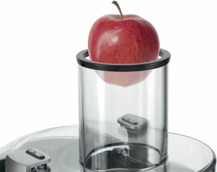 | Прочие особенности и свойства | Большое загрузочное отверствие для фруктов (целых яблок) и овощей – без предварительной нарезки. Сито из нержавеющей стали для оптимальной экстракции сока. Система «Капля-стоп» предотвращает появление капель сока на рабочей поверхности после окончания отжима Максимально безопасна:двигатель работает только в случае, когда прибор собран правильно и крышка закрыта. Два скоростных режима для мягких и твердых фруктов. |