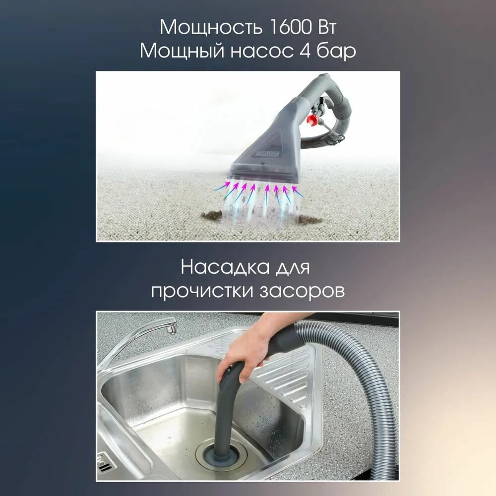 | Особенности | "Максимальная мощность 1600 Вт. Нагнетательный насос моющего раствора 4 бара. Резервуар для чистой воды 4,7 л. Может собрать 7 л. грязной воды. Корпус 20 л из нержавеющей стали" |