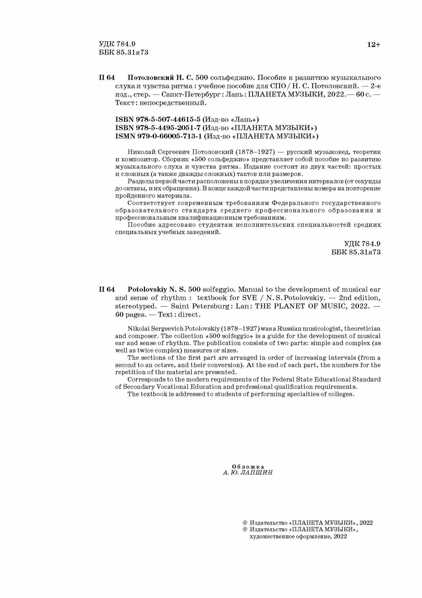500 сольфеджио. Пособие к развитию музыкального слуха и чувства ритма. Ноты. Учебное пособие для СПО (Потоловский Николай Сергеевич); Планета Музыки, 2022