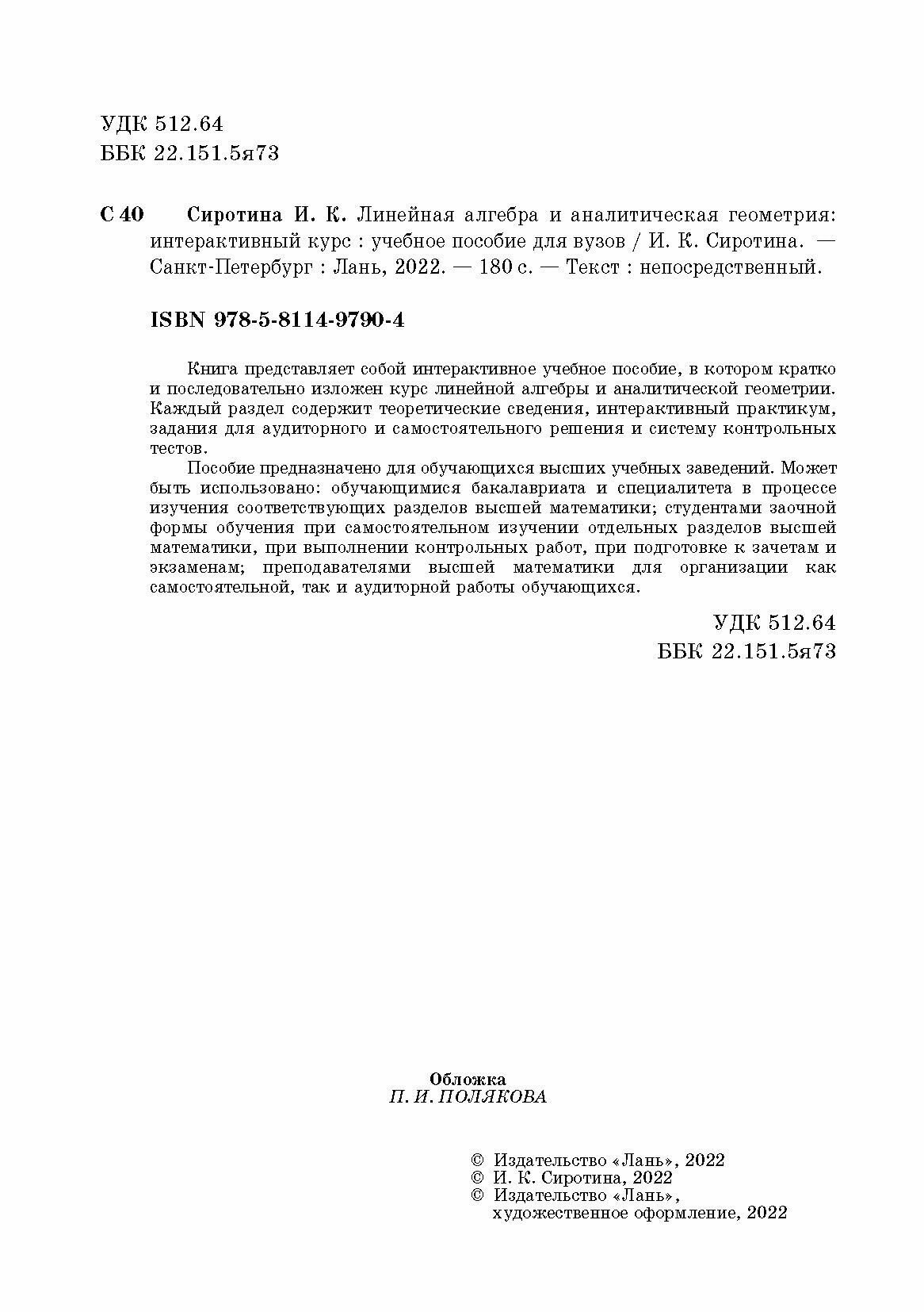 Линейная алгебра и аналитическая геометрия. Интерактивный курс (И. К. Сиротина); Издательство ЛАНЬ, 2022