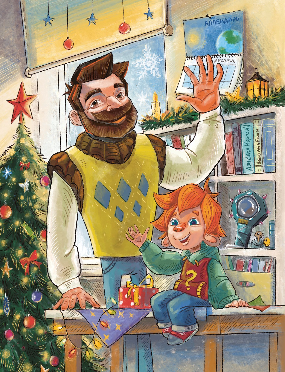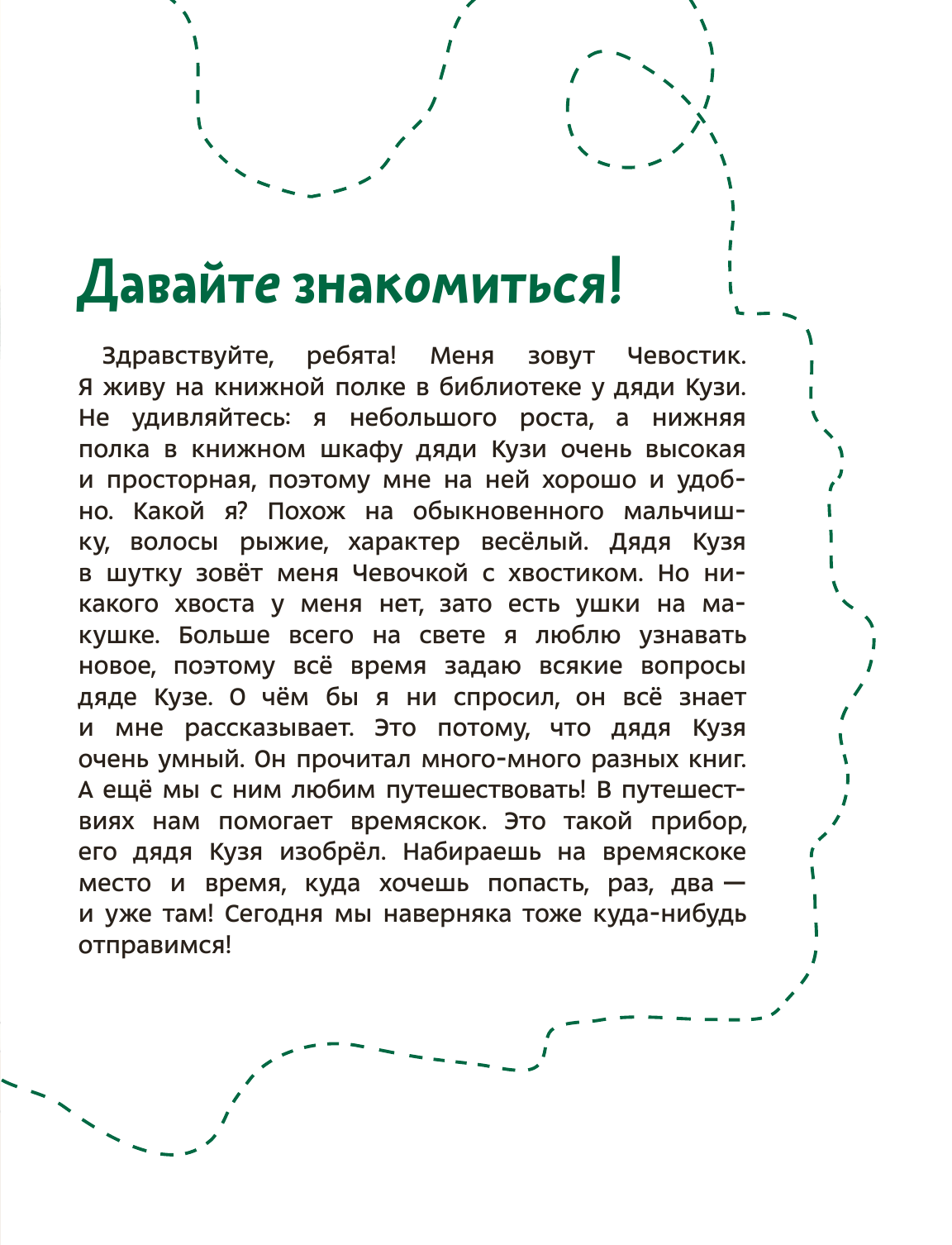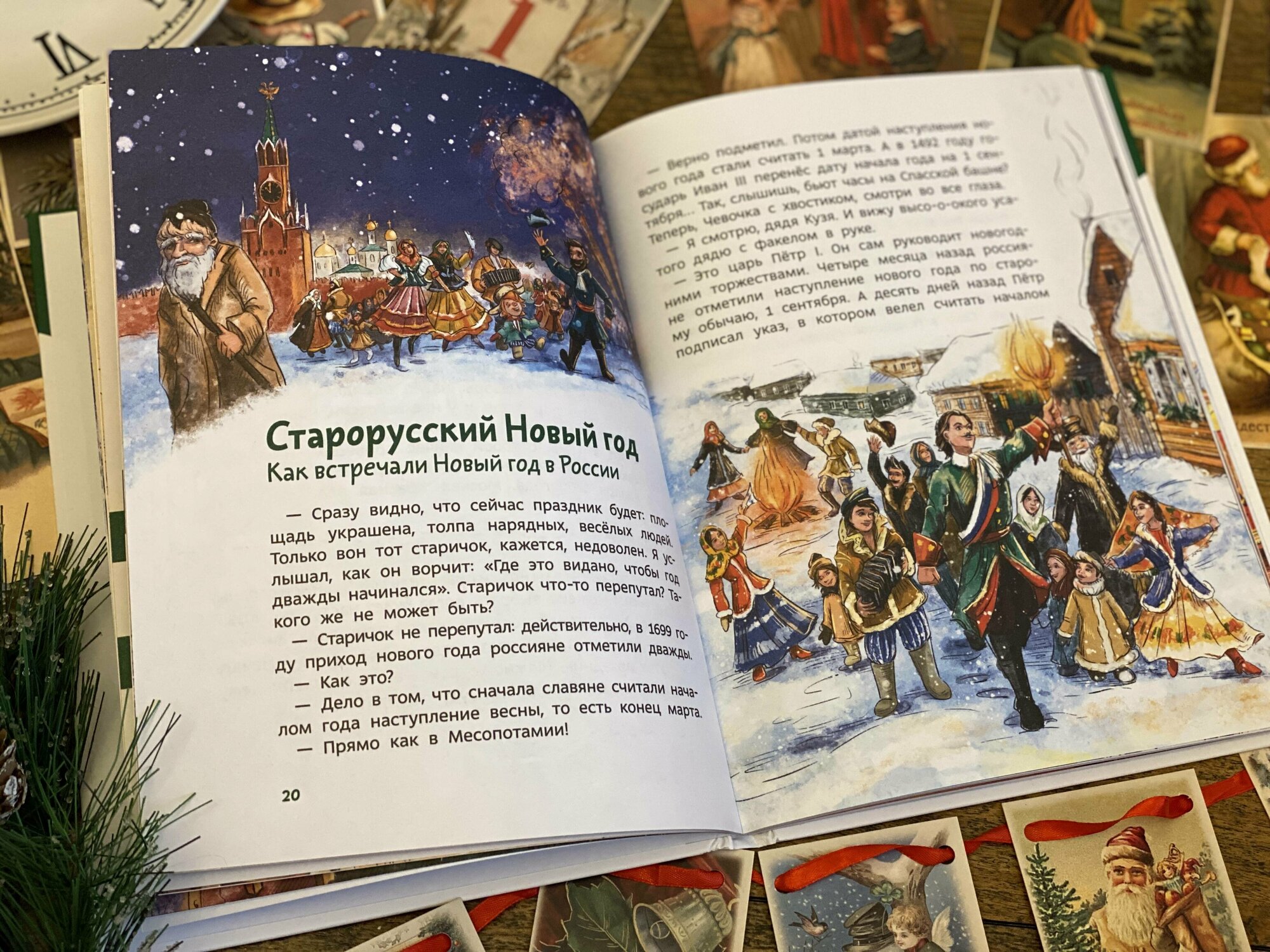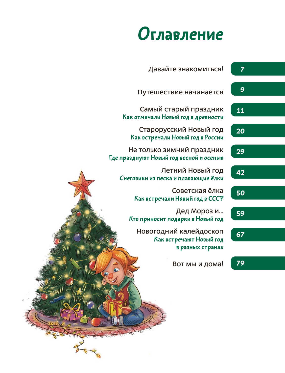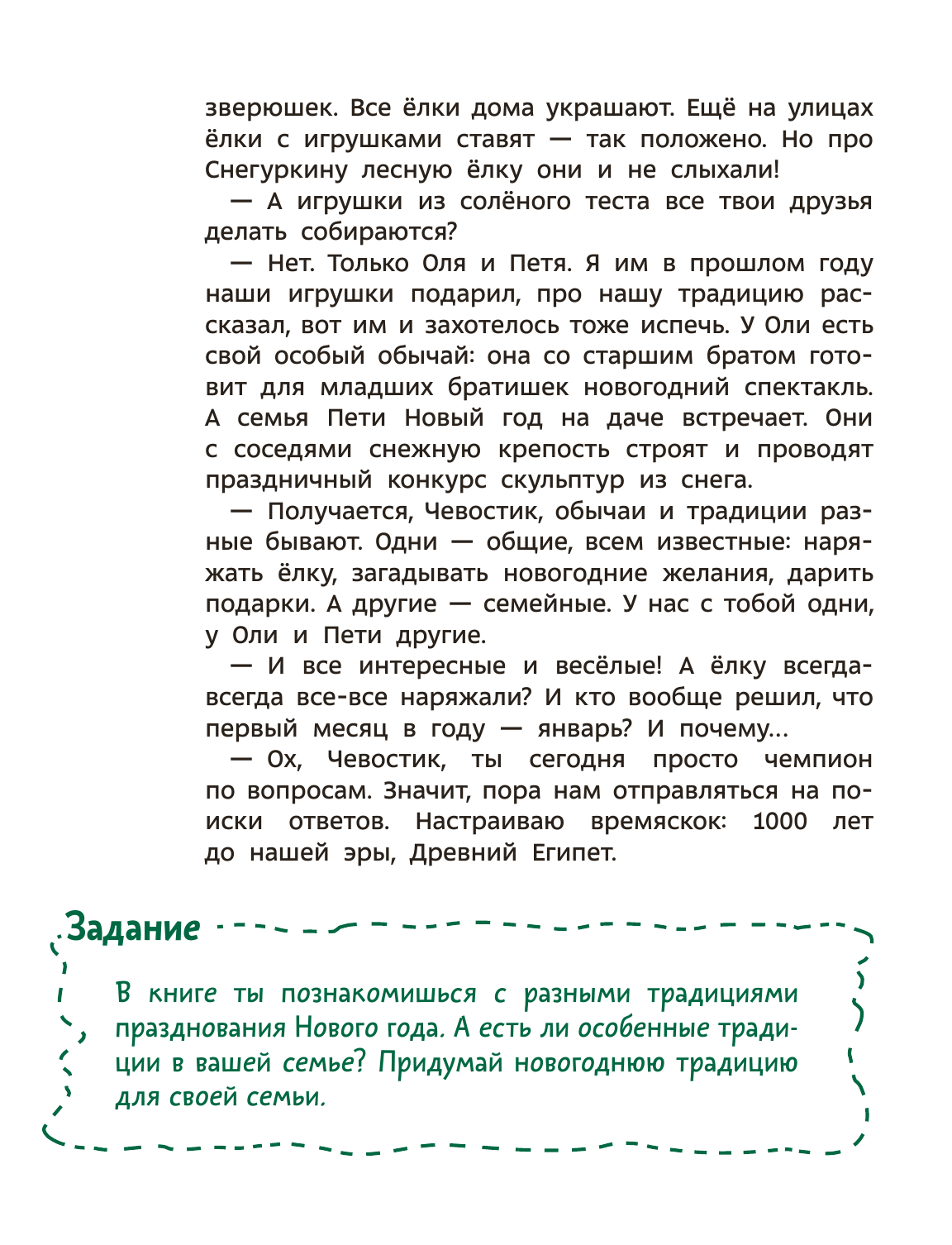В новой книге серии детских энциклопедий Чевостик и Дядя Кузя увидят, как встречали Новый год в древности, и побывают на шумных празднествах в эпоху Петра I. Они посетят вторую всесоюзную ёлку в доме Советов, заглянут на современные торжества по всему миру от Китая до Австралии и познакомятся с зимними волшебниками, приносящими подарки детям: Кыш Бабаем, Шурале, старцем Ямалом Ири и весёлым морозецем Паккайне. А еще узнают, что Новый год празднуют не только зимой, но весной, осенью и... даже летом!