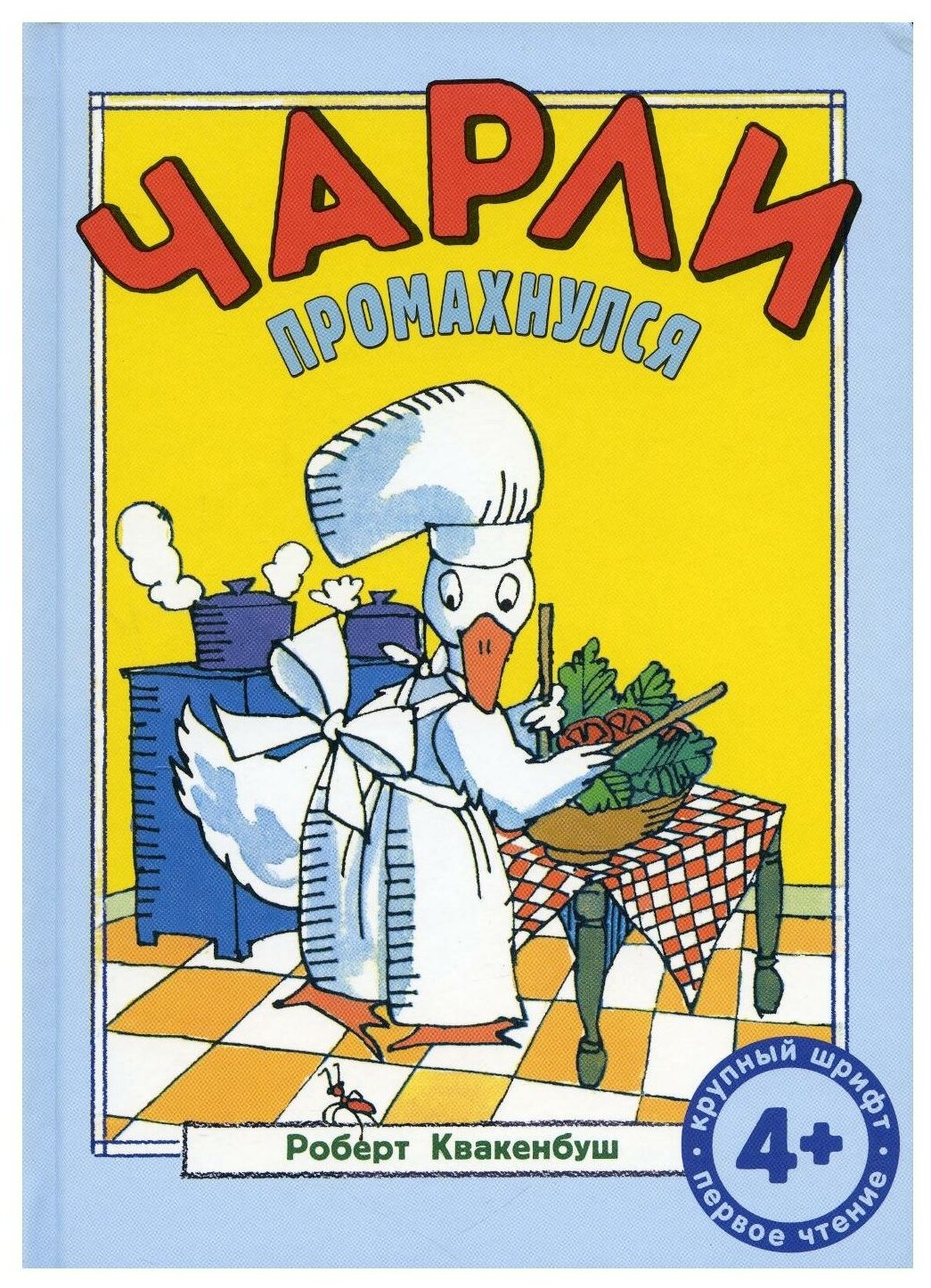 Утенок Чарли готовил угощение для своей подруги Клары, которую он пригласил на ужин. И внезапно увидел на полу муравья. Какой кряшмар! Насекомые в доме! Клара решит, что он грязнуля! Вот какие мысли пронеслись в его утиной голове буквально за секунду. Чарли погнался за муравьем и загнал его под плиту. Чтобы отодвинуть плиту, Чарли понадобилось выключить газ и снять все кастрюльки. Но муравей успел юркнуть в трещинку на стене. Чарли принес молоток и стукнул по стене. Муравей как будто испарился. Чарли все бил и бил, дыра все росла и росла. За стеной Чарли увидел водопроводную трубу и спокойно сидящего на ней муравья. Чарли хорошенько прицелился и треснул молотком по трубе. В муравья он не попал, зато пробил трубу. Из пробоины хлынула вода, которая затопила, а потом и смыла его дом. Бедному Чарли пришлось искать себе другое пристанище. Устроившись на новом месте, он снова пригласил Клару на ужин. И снова увидел муравья. Но он хорошо запомнил прошлый урок и на этот раз поступил иначе. Серию про незадачливого утенка Генри, в русском переводе Чарли, придумал и нарисовал американский писатель и иллюстратор Роберт Квакенбуш (1929-2021). Смешные истории с неожиданным финалом понравятся детям от 4-х лет. Слушая, малыш будет с интересом следить за развитием событий и на всех картинках искать муравья, которого художник постарался получше спрятать. А дети постарше смогут с удовольствием прочитать книгу самостоятельно. Крупный четкий шрифт, короткие предложения и намеренное использование одних и тех же слов и конструкций облегчат им эту задачу. Все книги про утенка Чарли «Чарли промахнулся» «Чарли идет на день рождения» «Чарли становится няней» «Чарли на тренировке»